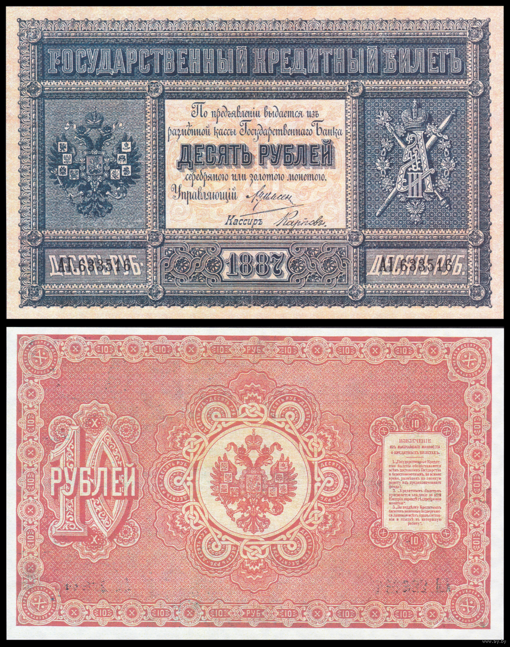 [КОПИЯ] 10 рублей 1887г. Упр. Цимсен-Карпов (водяной знак)