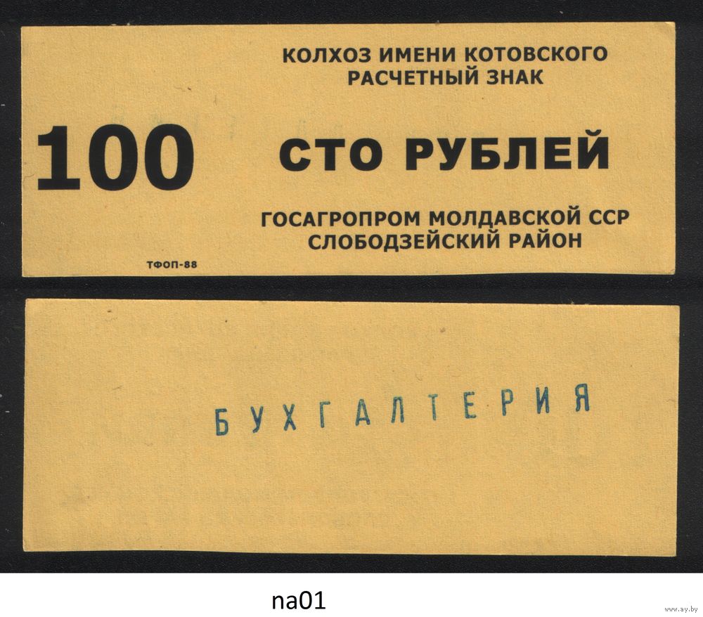 Копия Молдавская ССР госагропром Слободзейский район колхоз имени Котовского расчетный знак на 100 рублей na01 ТОРГ/ВАША ЦЕНА