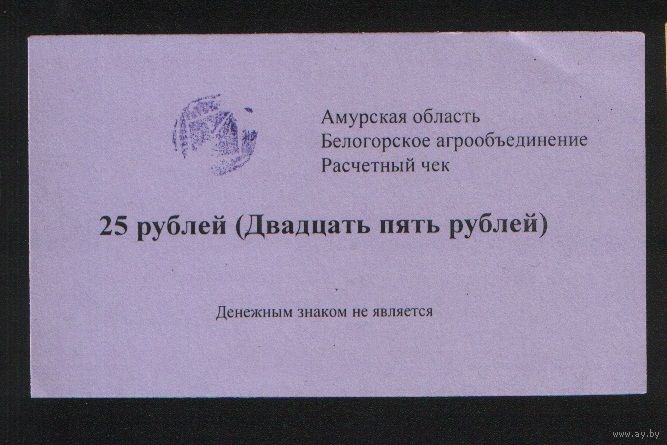 Копия Россия Амурская обл Белогородское агрообъединение расчетный чек на 25 рублей n062 ТОРГ/ВАША ЦЕНА