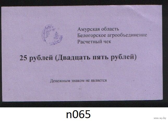 Копия Россия Амурская обл Белогородское агрообъединение расчетный чек на 25 рублей n065 ТОРГ/ВАША ЦЕНА