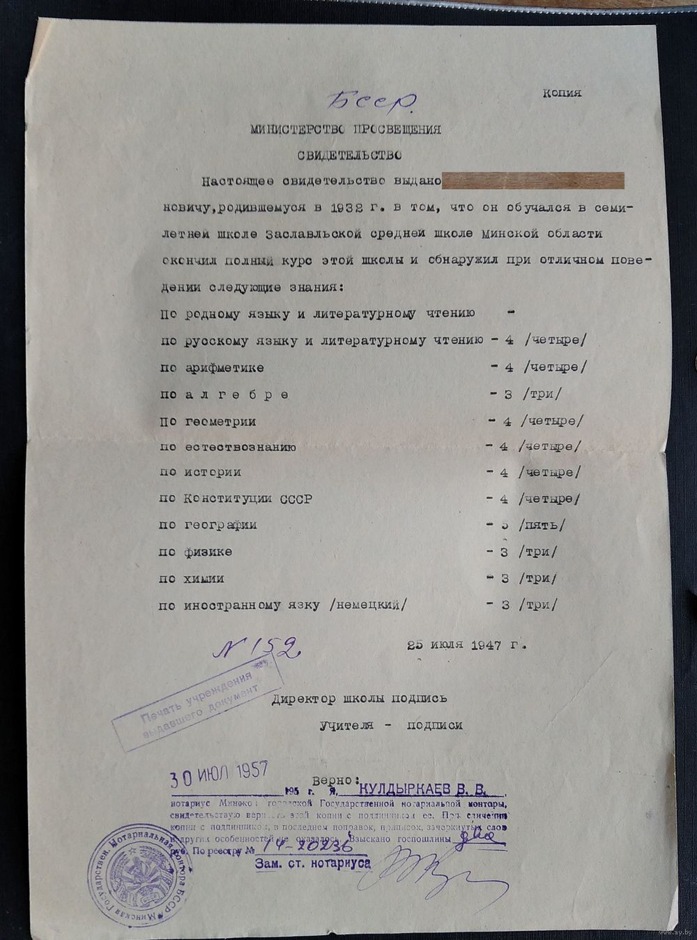 Копия свидетельства об окончании Заславльской средней школы. Штамп нотариуса. 1957 г