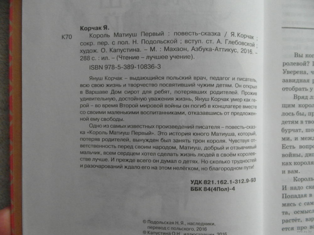 Януш Корчак - выдающийся польский врач, педагог и писатель. Всю свою жизнь он посвятил детям-сиротам, к которым относился с огромной любовью и заботой. Одно из самых известных произведений писателя - повесть-сказка `Король Матиуш Первый` (1923). Это история юного Матиуша, который, рано потеряв родителей, вынужден был занять трон короля. Чувствуя ответственность перед своим народом, Матиуш, добрый и отзывчивый мальчик, всем сердцем хотел сделать жизнь людей в своем королевстве лучше. И прежде всего он думал о детях. Но сколько трудностей и разочарований ждало его на этом нелегком, но благородном пути!