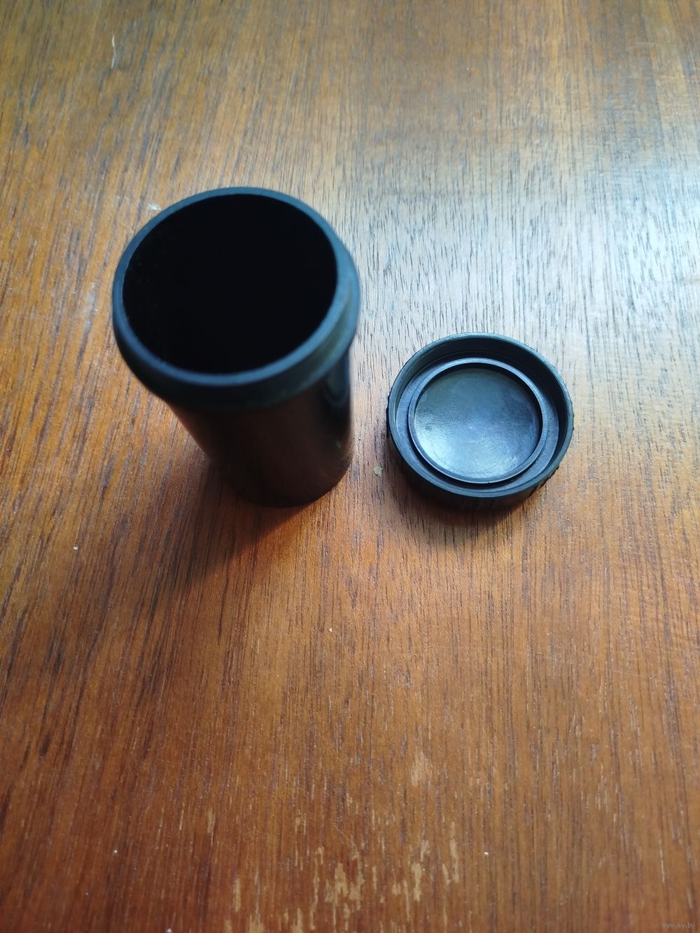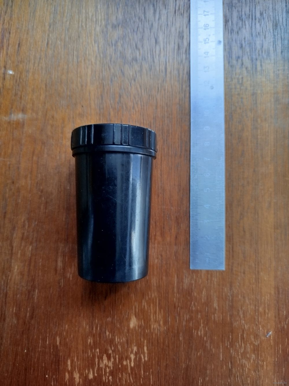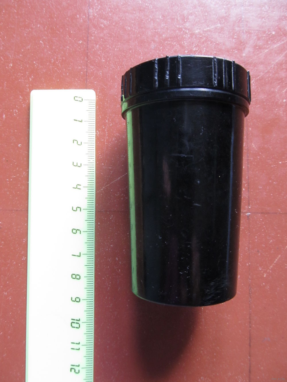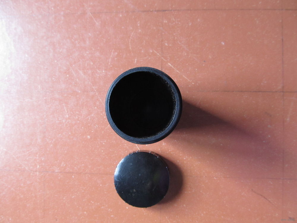 С завинчивающейся крышкой, с мелкой резьбой. Высота -8,3 см . Диаметры - 4,5 см (крышка), 4,1 см (дно).