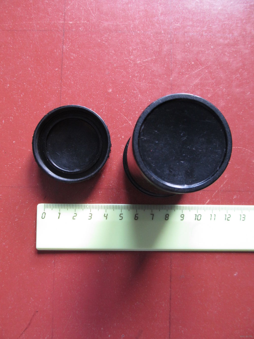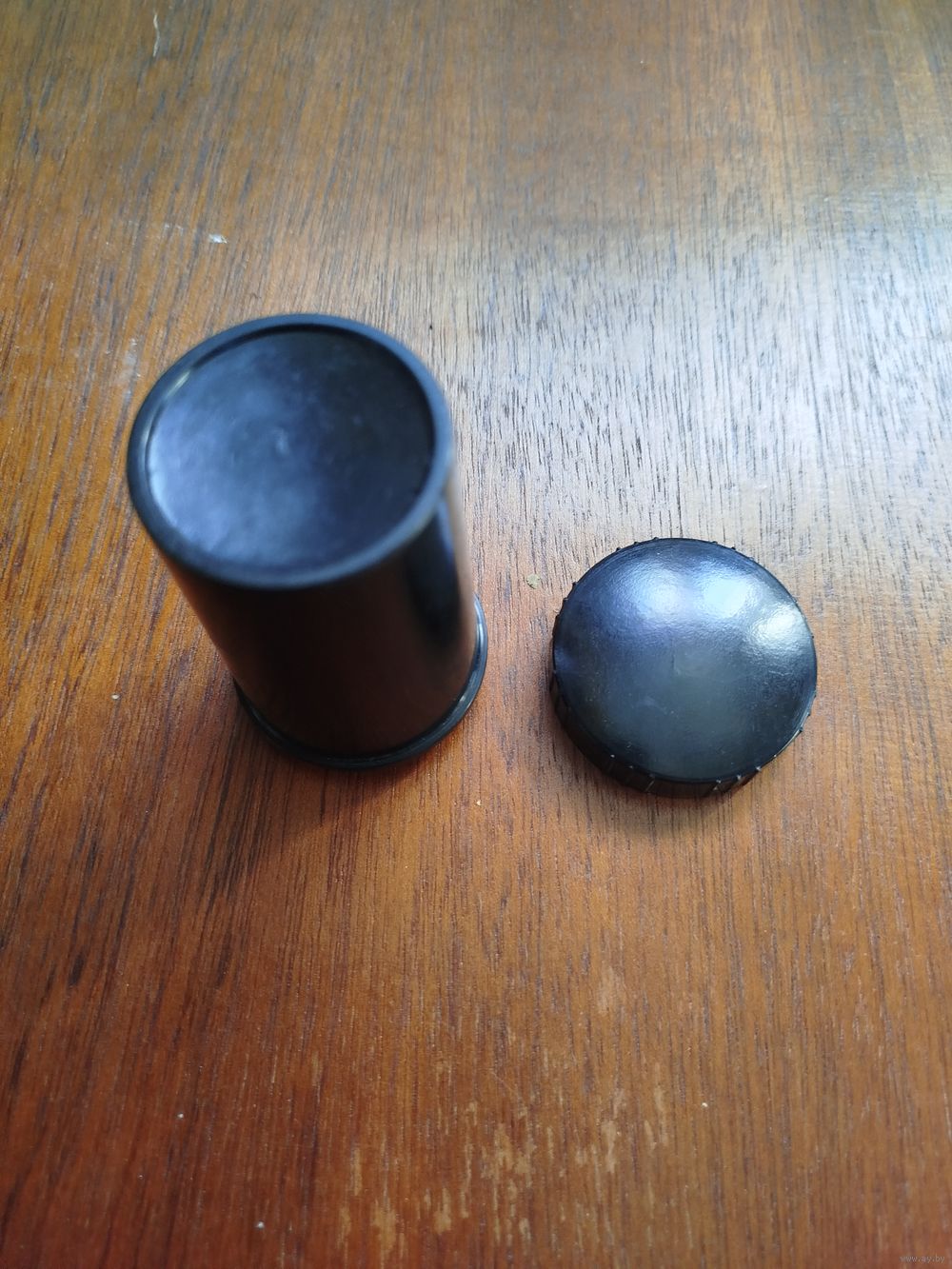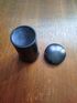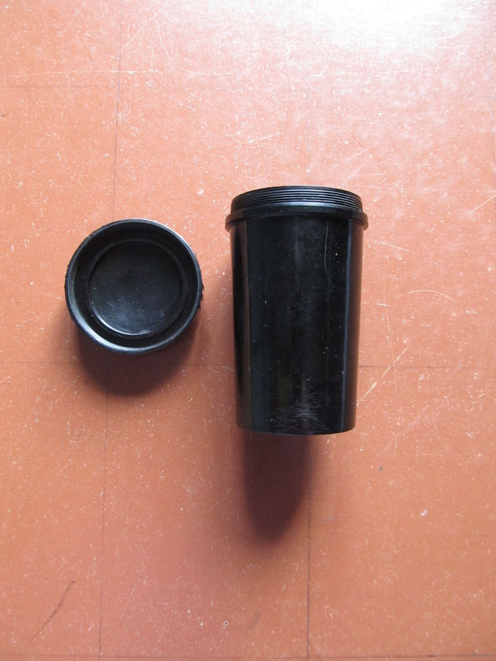 С завинчивающейся крышкой, с мелкой резьбой. Высота -8,3 см . Диаметры - 4,5 см (крышка), 4,1 см (дно).