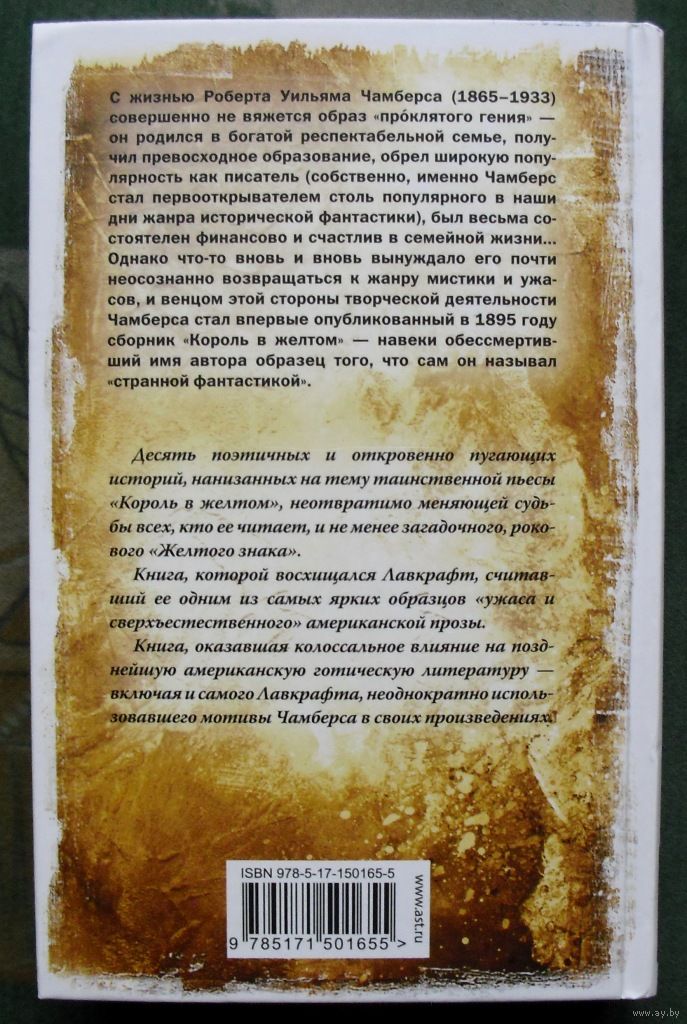 Десять историй под одной обложкой! Ранние работы Чамберса являются признанной классикой жанра «хоррор». Рассказы стали одним из основных источников вдохновения создателя «Мифов Ктулху» Говарда Лавкрафта. Также, Чамберс повлиял на творчество Джорджа Мартина, Нила Геймана, Стивена Кинга, Терри Пратчетта и многих других современных писателей.