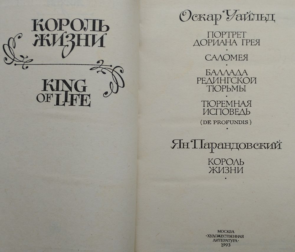 496 стр. Книгу составили сочинения Оскара Уайльда (1854—1900), послужившие основой для романа о «блистательном Оскаре» польского писателя, мастера биографической прозы, Яна Парандовского (1895—1978) «Король жизни» (1930), также включенного в книгу. Уайльд представлен произведениями: "Портрет Дориана Грея", "Саломея", "Баллада Редингской тюрьмы" и "Тюремная исповедь". «Среди пошлости XIX века распустился цветок греческой легенды. В древности ему ставили бы статуи... воздвигали бы храмы»,— пишет Парандовский в одном из своих очерков и сравнивает Уайльда с «золотой статуей, которую человеческая посредственность, тупая и жестокая глупость повалили на серую склизкую мостовую». Оскар Парандовского — это красивый и яркий человек, блестящий собеседник, очаровывающий любого, а в несчастье способный к состраданию.