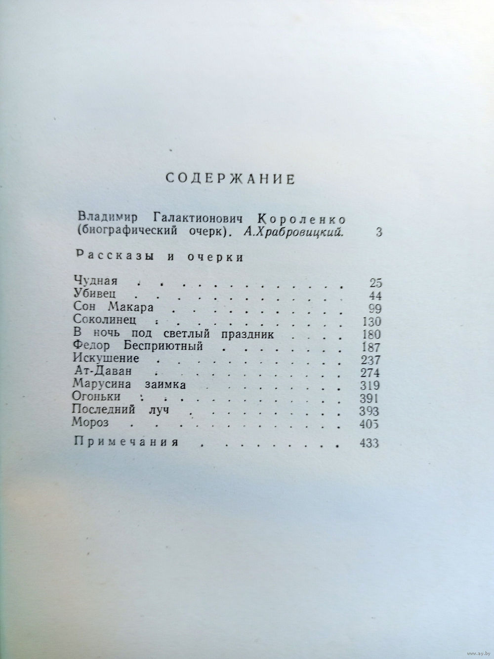 1. рассказы и очерки: "Чудная", "Убивец", "Сон Макара", "Соколинец" и др.\n2. повести и рассказ: "В дурном обществе", "Лес шумит", "Слепой музыкант", "Ночью", "Судный день" и др.\n3. рассказы и очерки: "Глушь", "Старый звонарь", "За иконой", "на затмении", "В пустынных местах" и др. \n4. повести и рассказы: "На заводе", "Без языка", "Фабрика смерти", "В Крыму" и др.\n5. публицистика : "Мултанское жертвоприношение", "Дом №13", "Сорочинская трагедия", "Бытовое явление", "Памяти Белинского", "Л.Н.толстой" и др.