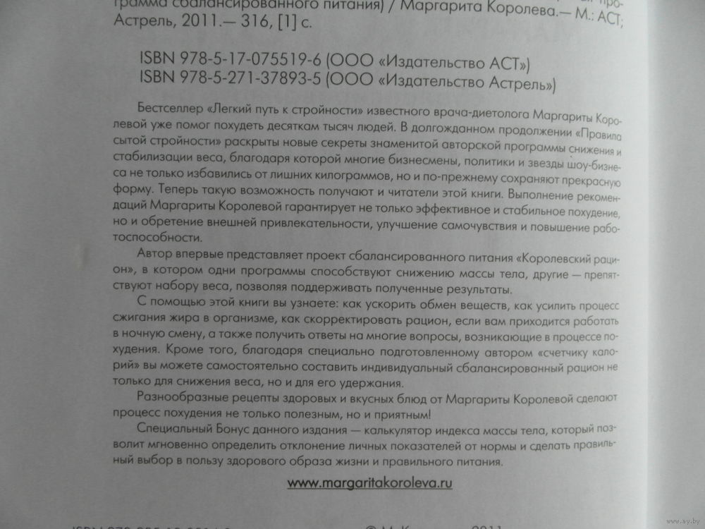 Бестселлер Легкий путь к стройности известного врача-диетолога Маргариты Королевой уже помог похудеть десяткам тысяч людей. В долгожданном продолжении Правила сытой стройности раскрыты новые секреты знаменитой авторской программы снижения и стабилизации веса, благодаря которой многие бизнесмены, политики и звезды шоу-бизнеса не только избавились от лишних килограммов, но и по-прежнему сохраняют прекрасную форму. Теперь такую возможность получают и читатели этой книги. Выполнение рекомендаций Маргариты Королевой гарантирует не только эффективное и стабильное похудение, но и обретение внешней привлекательности, улучшение самочувствия и повышение работоспособности. Автор впервые представляет проект сбалансированного питания Королевский рацион, в котором одни программы способствуют снижению массы тела, другие - препятствуют набору веса, позволяя поддерживать полученные результаты. С помощью этой книги вы узнаете: как ускорить обмен веществ, как усилить процесс сжигания жира в организме, как скорректировать рацион, если вам приходится работать в ночную смену, а также получить ответы на многие вопросы, возникающие в процессе похудения. Кроме того, благодаря специально подготовленному автором счетчику калорий вы можете самостоятельно составить индивидуальный сбалансированный рацион не только для снижения веса, но и для его удержания. Разнообразные рецепты здоровых и вкусных блюд от Маргариты Королевой сделают процесс похудения не только полезным, но и приятным! Специальный Бонус данного издания - калькулятор индекса массы тела, который позволит мгновенно определить отклонение личных показателей от нормы и сделать правильный выбор в пользу здорового образа жизни и правильного питания.