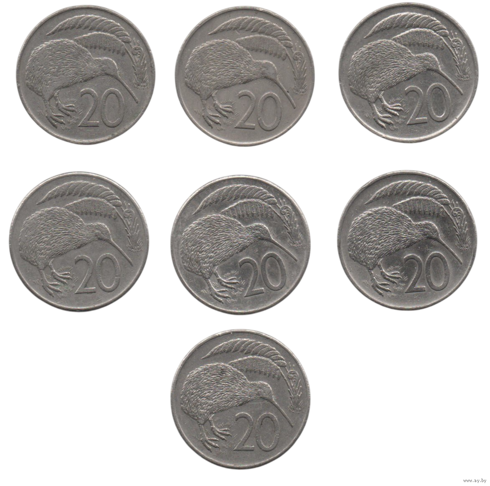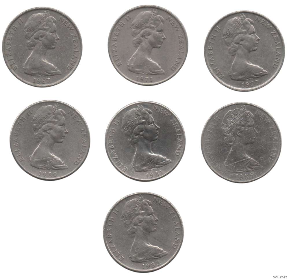 Королевство Новая Зеландия. 20 центов 1967, 1971, 1977, 1980, 1981, 1983, 1985. 2-й тип портрета. Фауна. Птица. Киви. Цена за одну монету.