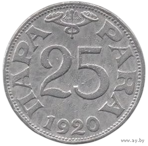 Королевство Сербов, Хорватов и Словенцев (Югославия). 25 пара 1920. Король Пётр І Карагеоргиевич; Принц Регент - Александр.