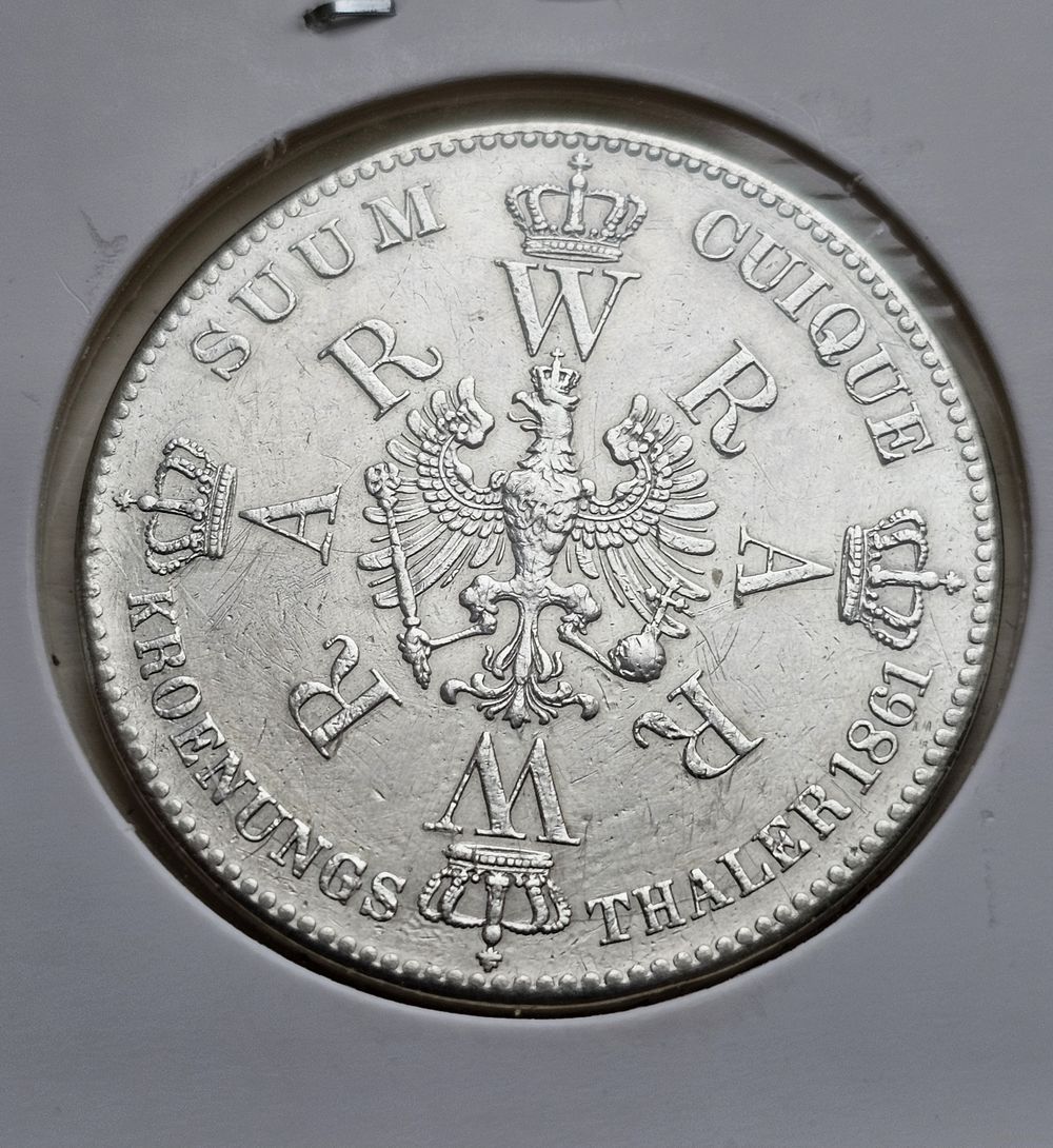 Это прусский талер 1861 года, выпущенный в честь коронации Вильгельма I и Августы.