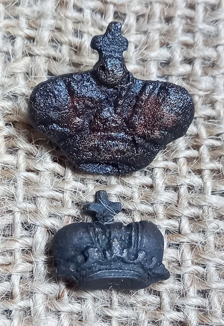 Короны РИ, бронза ,состояние на фото, размеры : болшая-21х23 мм( предположительно с перевязи ополченца),малая-14х16 мм(куда применялась предположений нет).