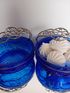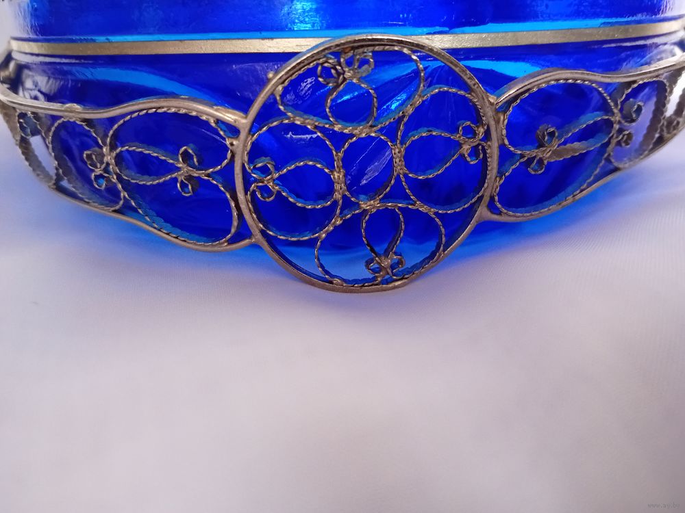 Уникальная корзинка - конфетница. Насыщенный синий цвет. Ручка - посеребренная скань из латуни. Размеры, мм: 170х170х60.