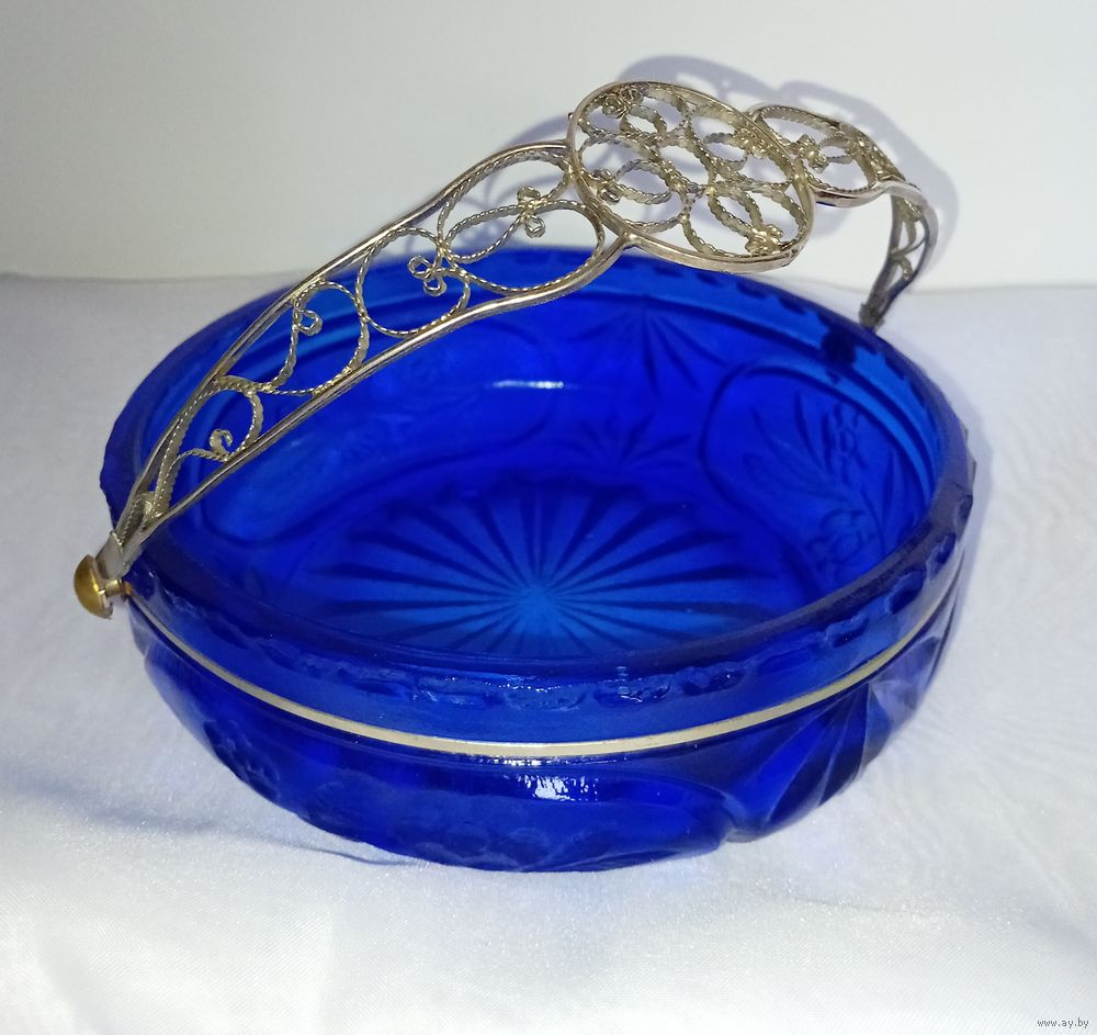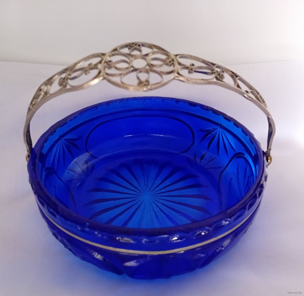 Уникальная корзинка - конфетница. Насыщенный синий цвет. Ручка - посеребренная скань из латуни. Размеры, мм: 170х170х60.