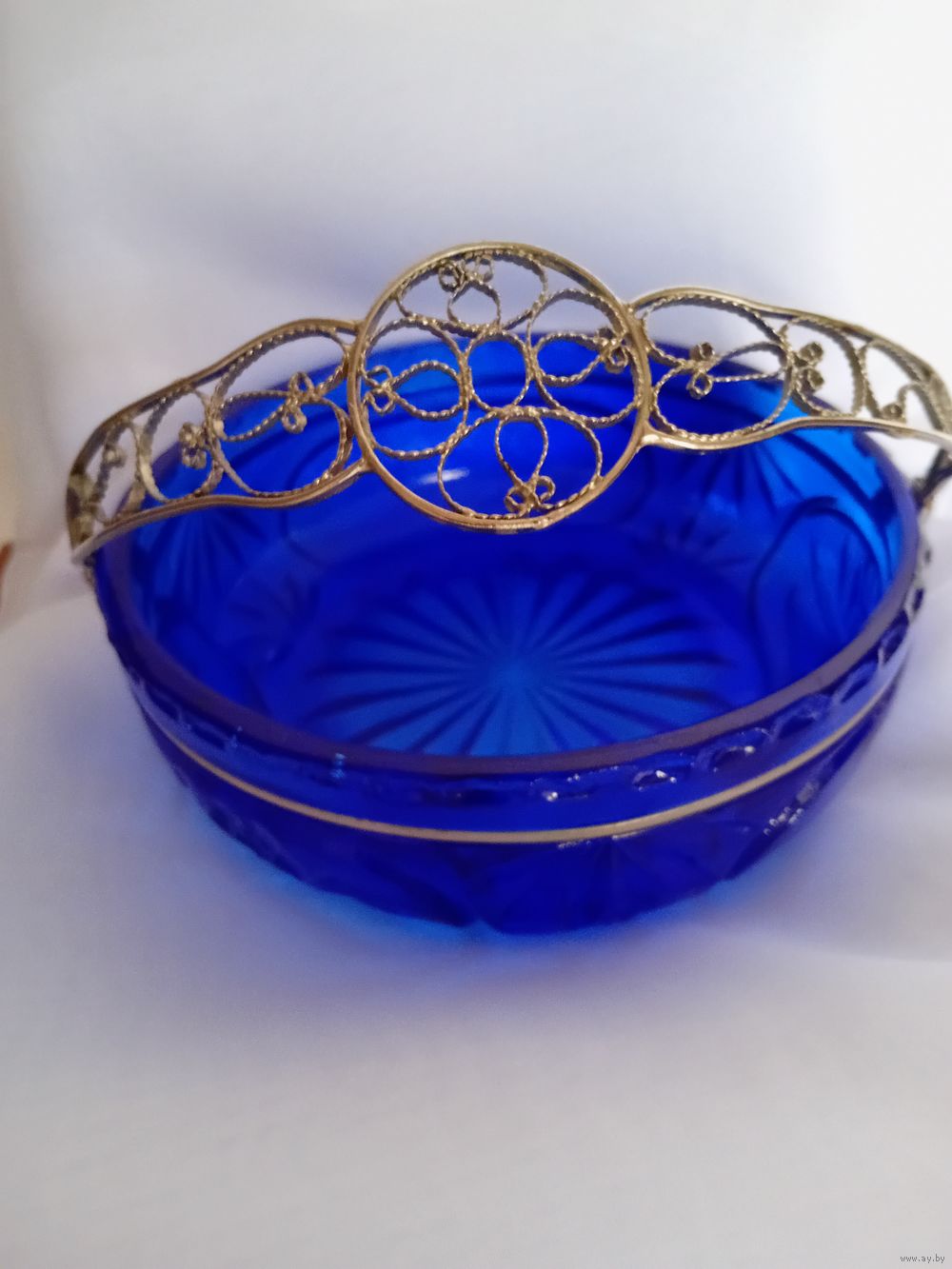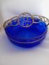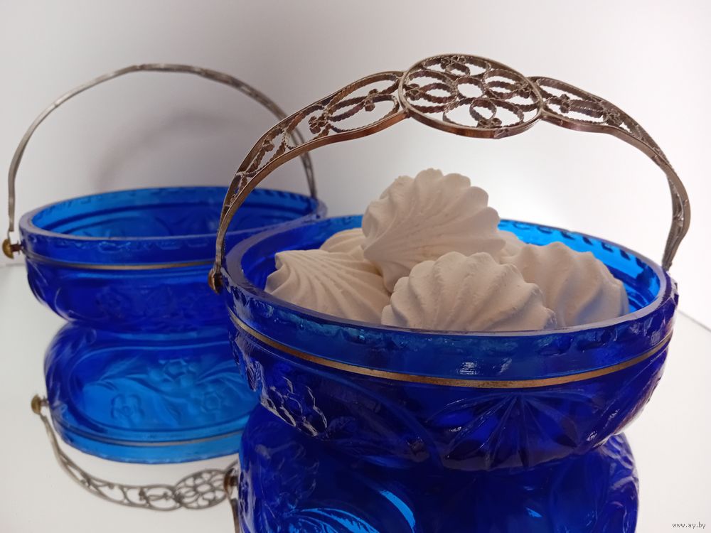 Уникальная корзинка - конфетница. Насыщенный синий цвет. Ручка - посеребренная скань из латуни. Размеры, мм: 170х170х60.