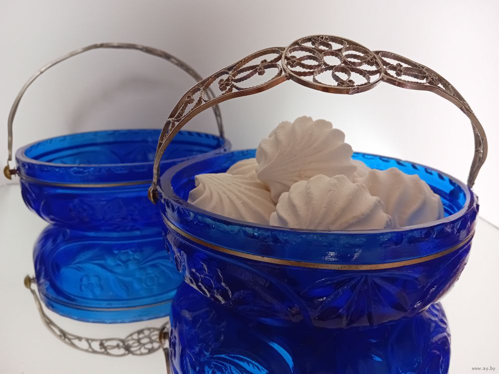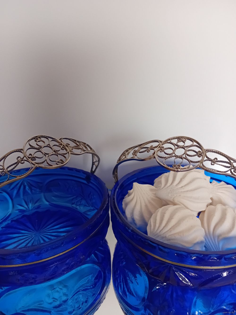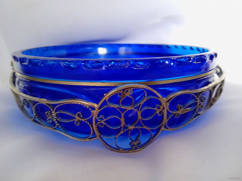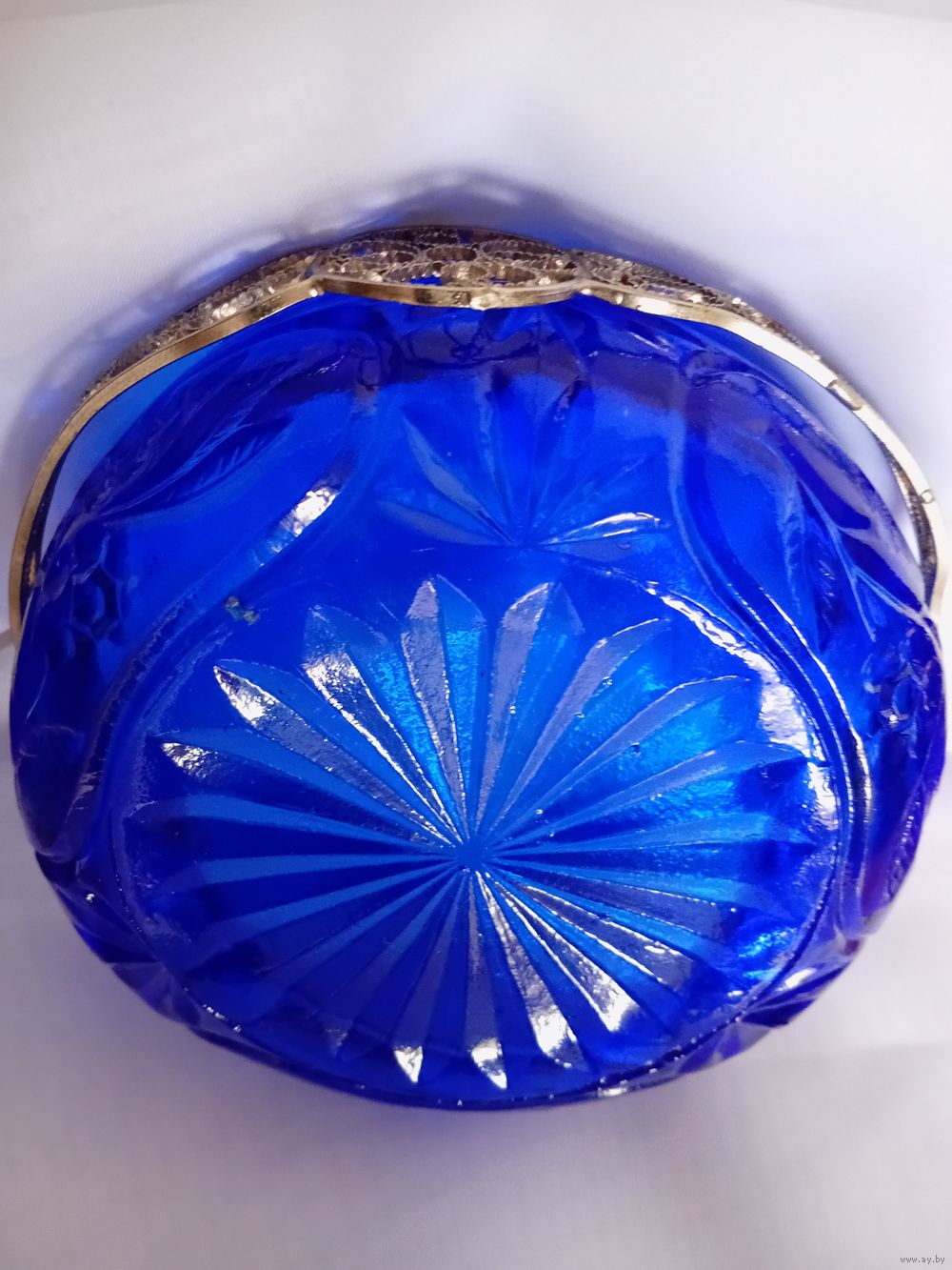 Уникальная корзинка - конфетница. Насыщенный синий цвет. Ручка - посеребренная скань из латуни. Размеры, мм: 170х170х60.