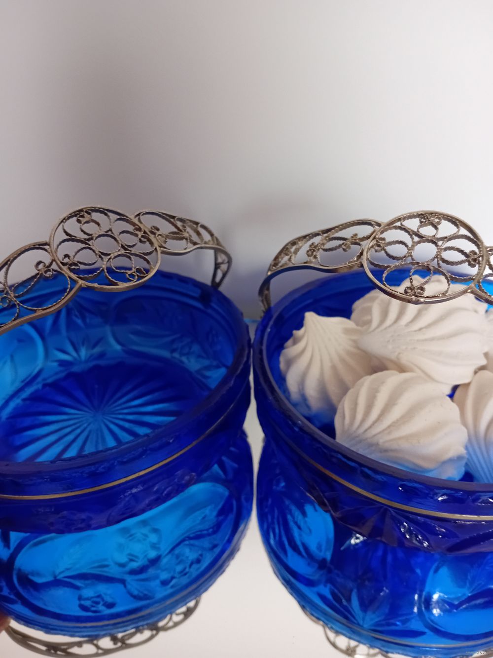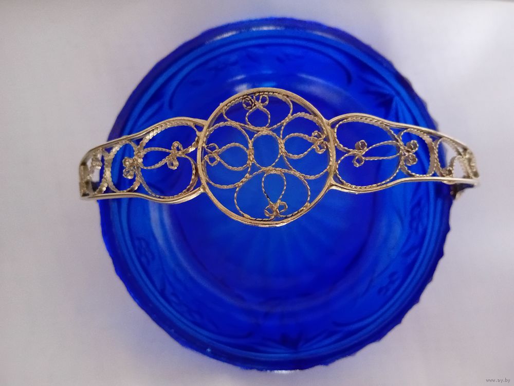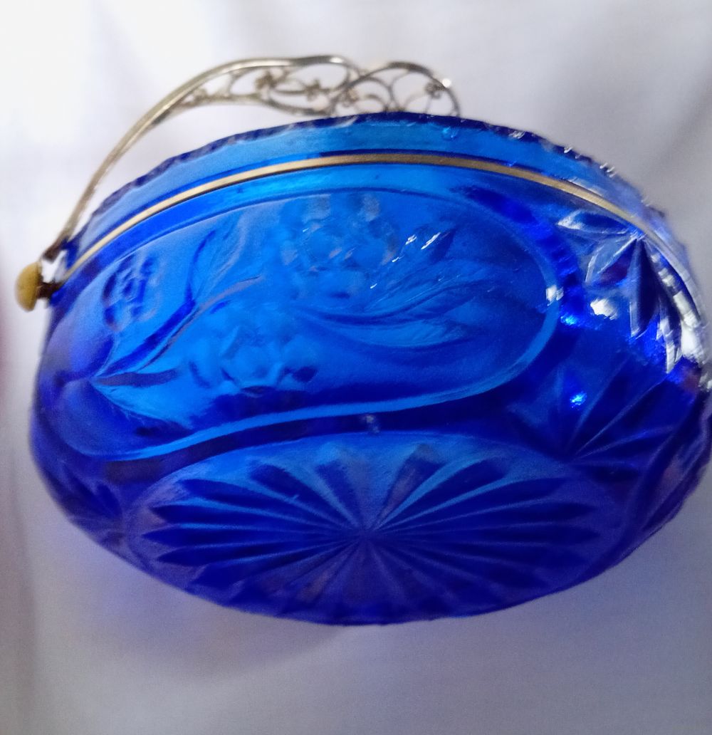 Уникальная корзинка - конфетница. Толстое стекло насыщенного синего цвета. Ручка - посеребренная скань из латуни. Размеры, мм: 170х170х60.