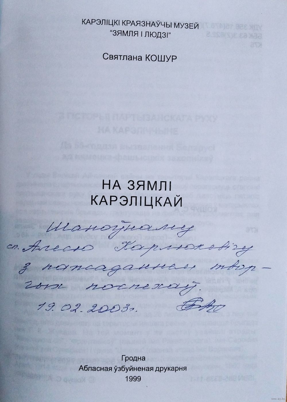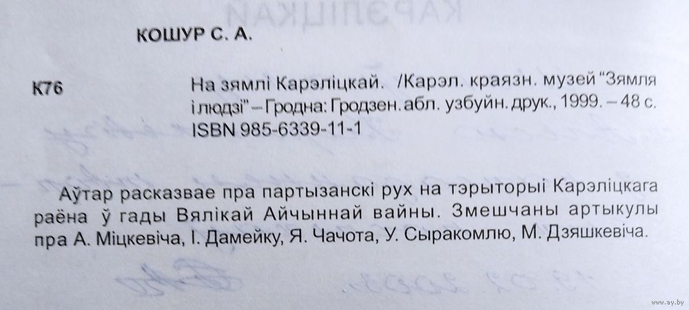 Кошур С. А. На зямлі Карэліцкай. Аўтограф аўтара. Карэл. краязн. музей "Зямля і людзі". - Гродна : Абл. узбуйн. друк., 1999 г. 46 с. Мяккая вокладка.