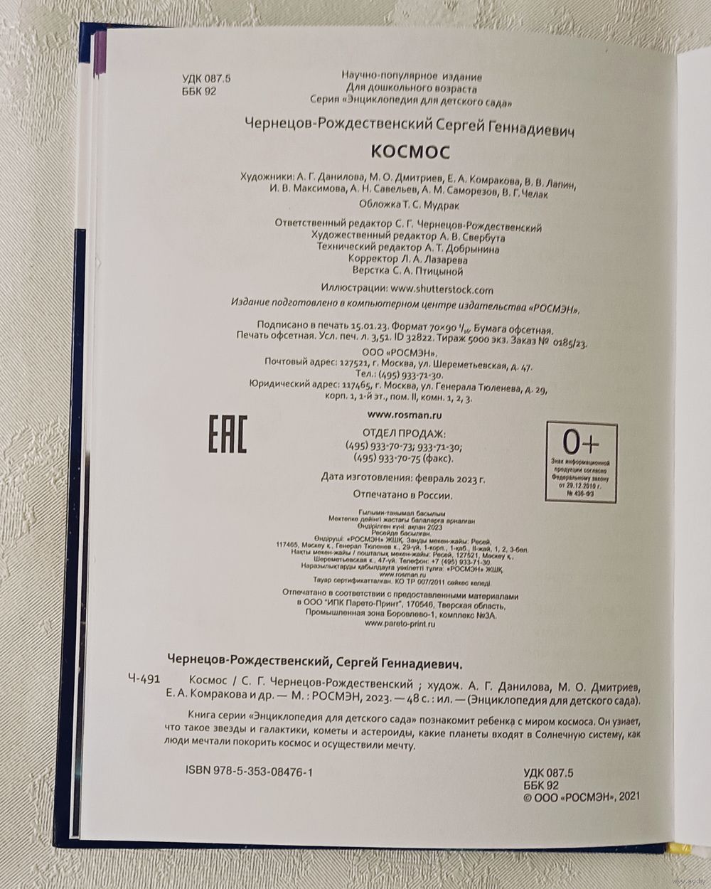 Чернецов-Рождественский Сергей Геннадиевич. Космос. Х удож. А. Г. Данилова, М. О. Дмитриев, Е. А. Комракова и др.- М.: РОСМЭН, 2023. — 48 с.: ил. (Энциклопедия для детского сада), твёрдый переплет, обычный формат.