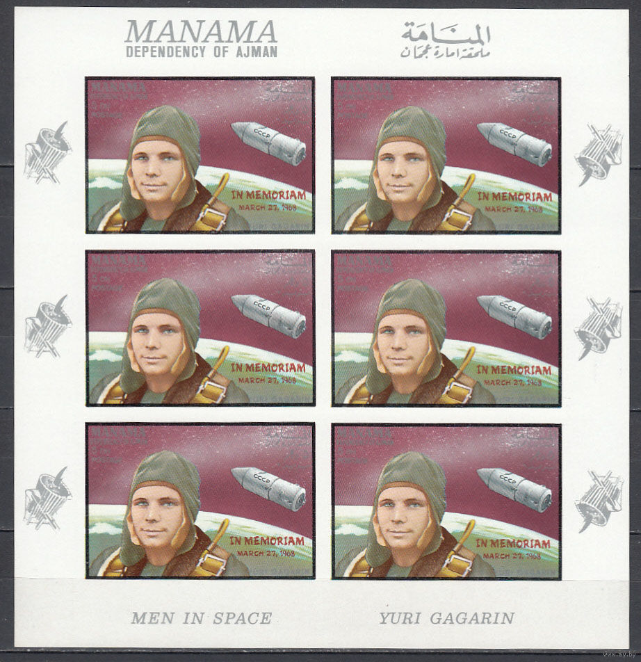 Космос. Гагарин. Манама (ОАЭ). 1969. Малый лист б/з с надпечатками. Michel N 211 (90,0 е)