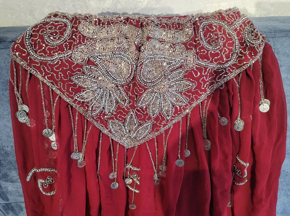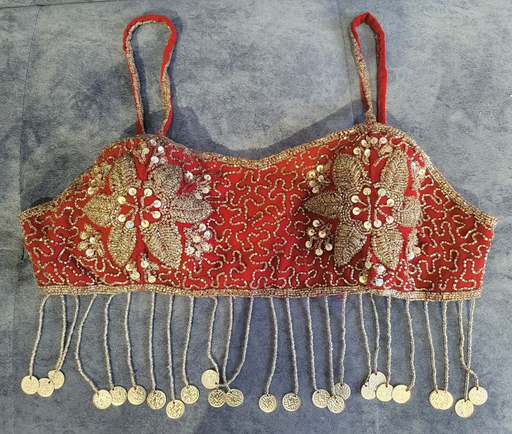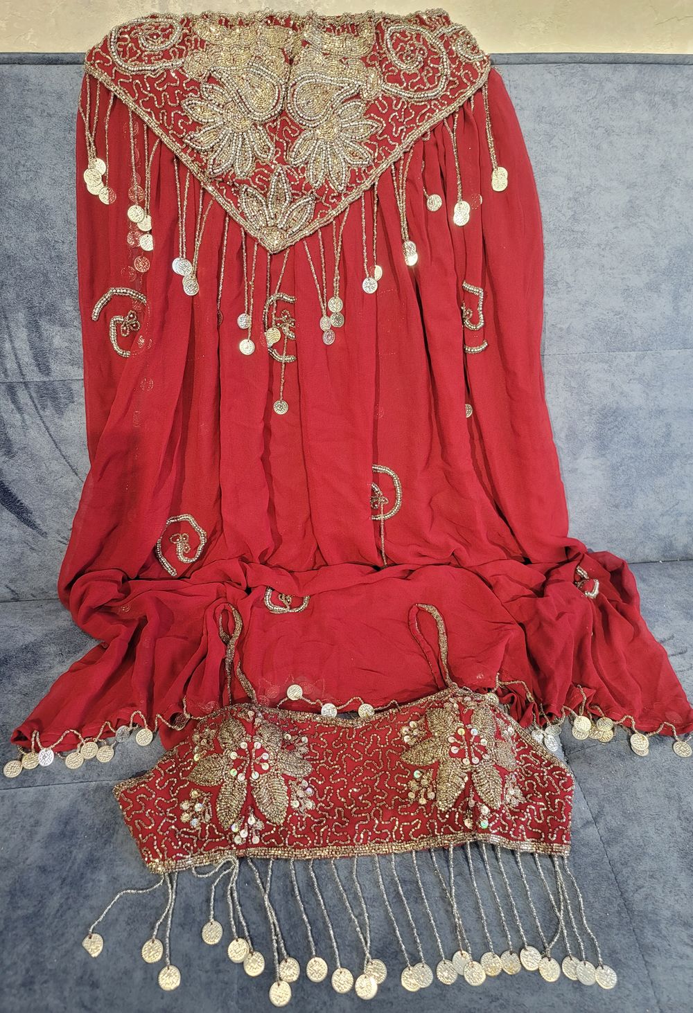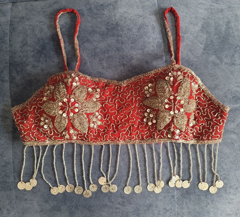 Костюм для восточных танцев. Производство Индия. Размер универсальный 46-52. Лифчик требует замены резинки. Ручная вышека.