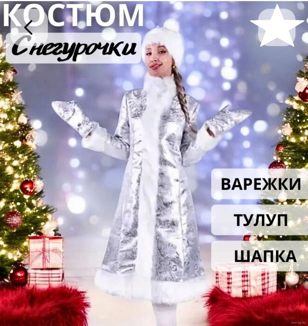 2)Костюм Снегурочки, р.48-50, цвет серый с блеском, в комплект входит шапка-пояс-варежки.
