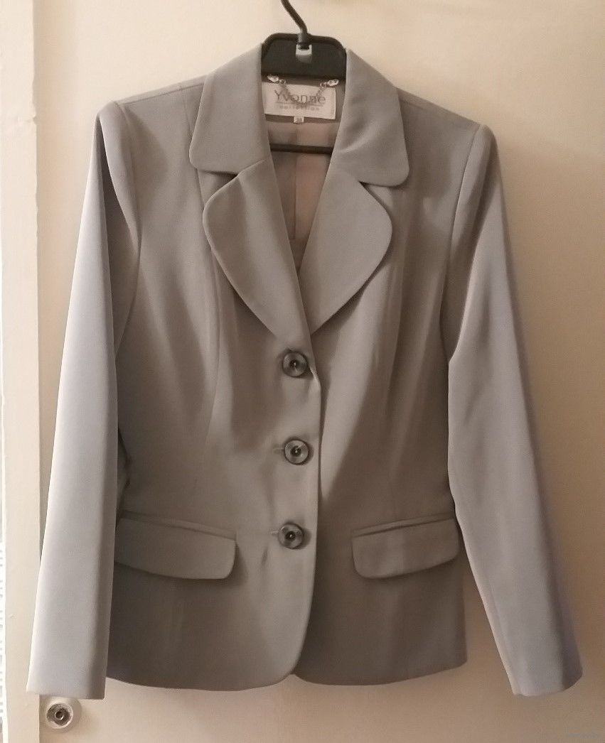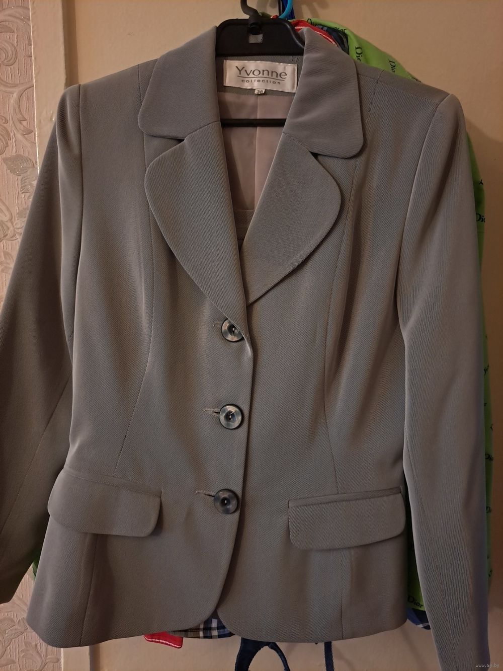 Костюм серый женский, р38-42, б.у 1раз как новый, длина пиджака-63см (от плеча до низа), длина рукавов-60см, по обхвату груди-92см, длина юбки-47см, ширина в поясе-68см.