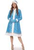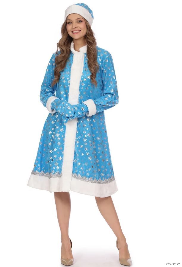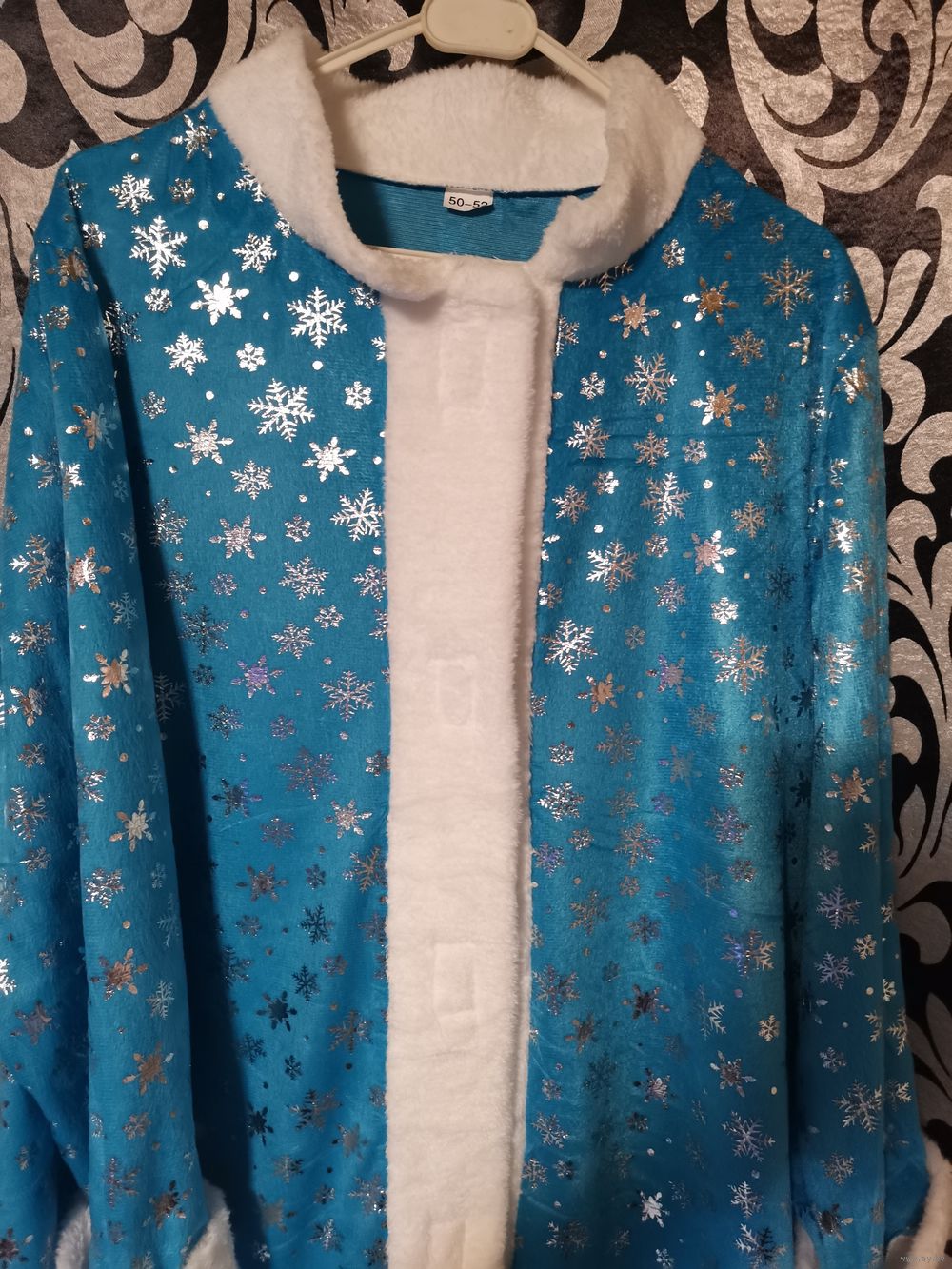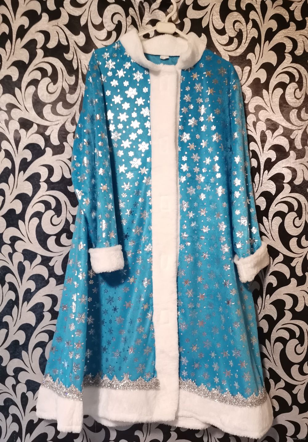 Карнавальный костюм Снегурочка. В комплект входит всё, что понадобится для создания реалистичного образа: шуба, шапка, рукавицы. Костюм из качественного бархатистого материала. Окантовка шубы выполнена из белого искусственного меха. Длинна по спинке 110см, длинна рукава 56 см ( можно регулировать за счёт меха) От плеча до плеча по спинке 48 см, ширина 127 (клёш)