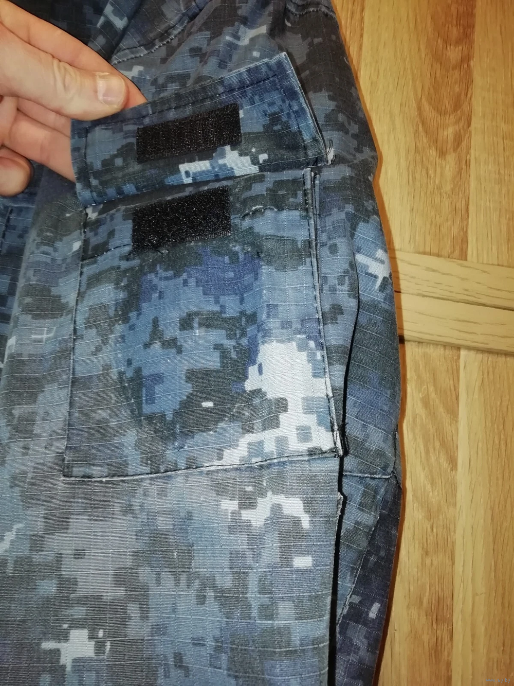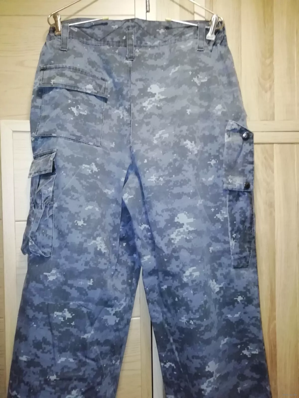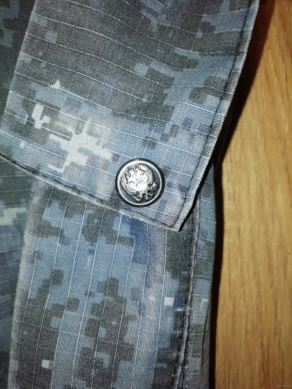 На задней части брюк один карман на пуговице. Два боковых кармана. Карман на липучке для снаряжения. Карман для ножа на клапане с металлическими заклепками, герб России. Орел. На коленях есть карман для защитной вставки на липучке.