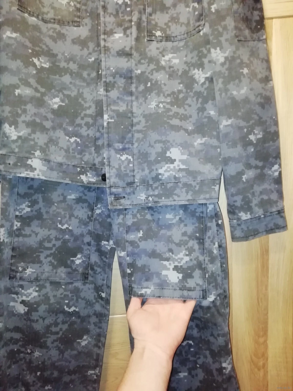 Куртка имеет два нагрудных кармана на пуговицах. Два наплечных кармана на липучках. Пришиты шевроны. Не в наличии. Пояс куртки эластичный и регулируемый. Вентиляция подмышек.