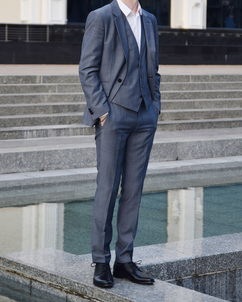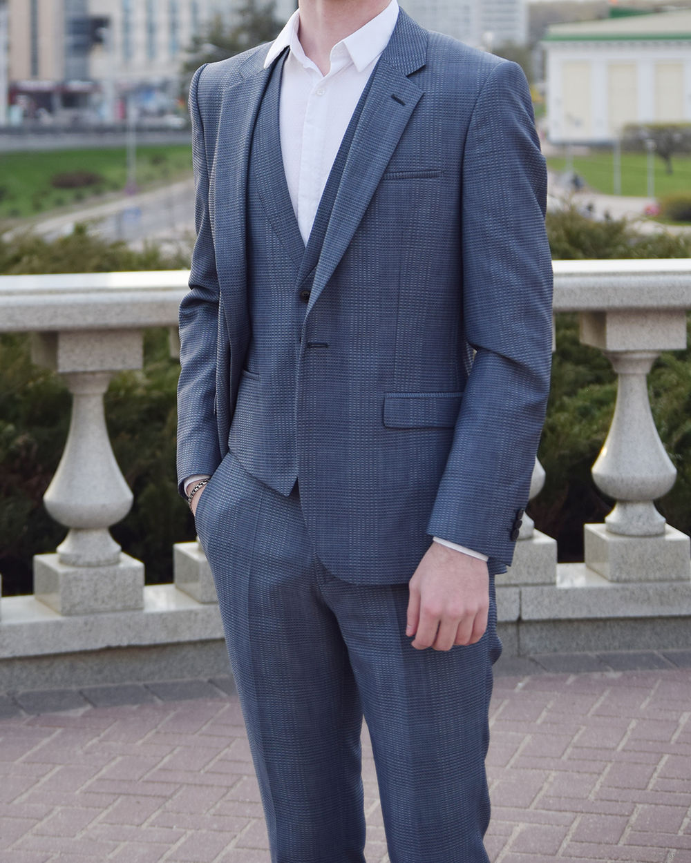 Оригинальный костюм-тройка Hugo Boss серо-голубоватого цвета с красивой текстурой (еле заметные квадраты, они видны на фото). Материал сделан из 100% шерсти, а все подкладки – из вискозы.