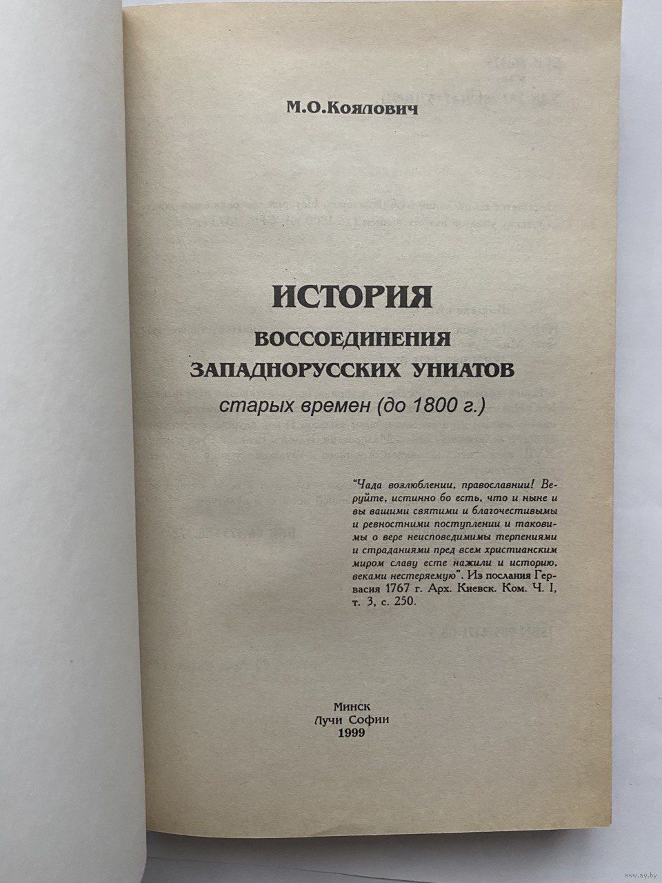 Одна из лучших монографий знаменитого русского историка консервативного направления. В книге глубоко воссоздается быт и религиозная жизнь Малороссии, Белой и Великой Руси в конце XVIII века с использованием огромного и труднодоступного материала по изданию 1873 года.В своей исследовательской работе он вновь вернулся к истории Брестской церковной унии. В 1873 г. докторское сочинение Кояловича - “История воссоединения западнорусских униатов старых времён (до 1800 г.)” - было напечатано. Хронологические рамки работы были невелики: они охватывали XVII и XVIII вв. Однако по глубине затронутых проблем, разнообразию источников, вводимых в научный оборот, по степени аргументированности выводов это исследование не утратило своего научного значения и сегодня. Оно является ценнейшим изданием по истории Брестской церковной унии. Коялович был первым историком, который обратил внимание читателя на эволюцию унии, заключающуюся в ее латинизации. Он убедительно показал роль базилианского ордена в этом процессе, определил значение провинциального собора в Замостье, подчеркнул необратимость вытеснения в униатской церкви православных обрядов католическими. Первым из отечественных историков Коялович поставил вопрос о кризисе униатской церкви, наступившем вследствие латинизации унии. Этот кризис он связывал и с появлением в среде униатских иерархов стремления к возврату “чистоты” унии. Исследователь убедительно доказал, что процесс возвращения к условиям 1596 года неизбежно приводит к сближению униатской церкви с православной и делает воссоединение двух церквей естественным и закономерным.