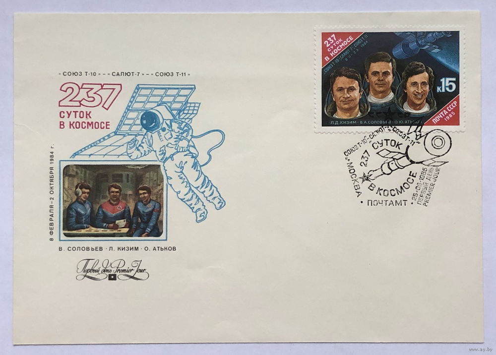 КПД с марками и штемпелем ПД 237 суток в космосе Л. Д. Кизима, В. А. Соловьева и О. Ю. Атькова на орбитальном комплексе Союз Т-10 - Салют-7 - Союз Т-11 1985
