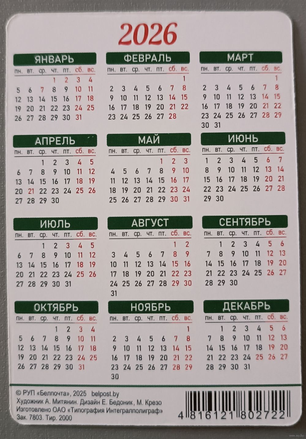 Крапивник. Календарик, глянец, 2026