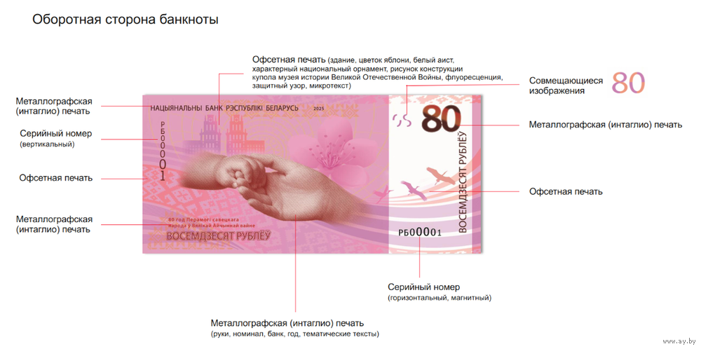 Красивая банкнота. Беларусь 80 рублей. 80 лет Победы советского народа в Великой Отечественной войне.