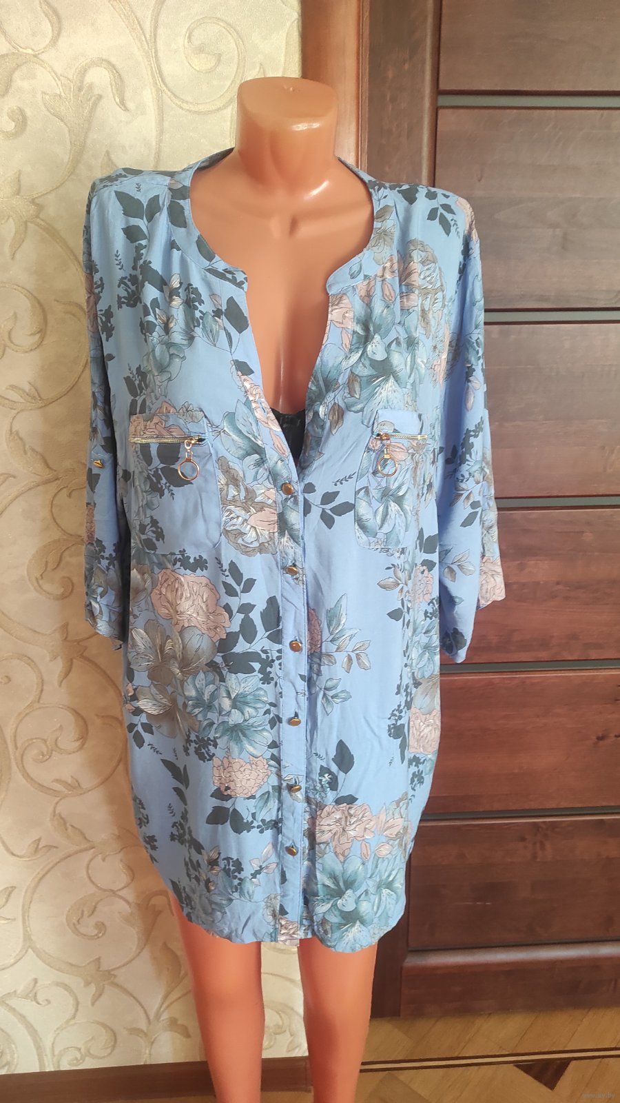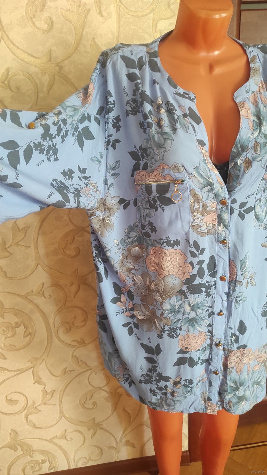 Нежно синего цвета, с красивым рисунком. Длина 78 см, ПОгруди 67 см. Качественная вискоза, приятная на ощупь. На рукавах и снизу есть защип, которым можно обыграть блузу. Отличное состояние.