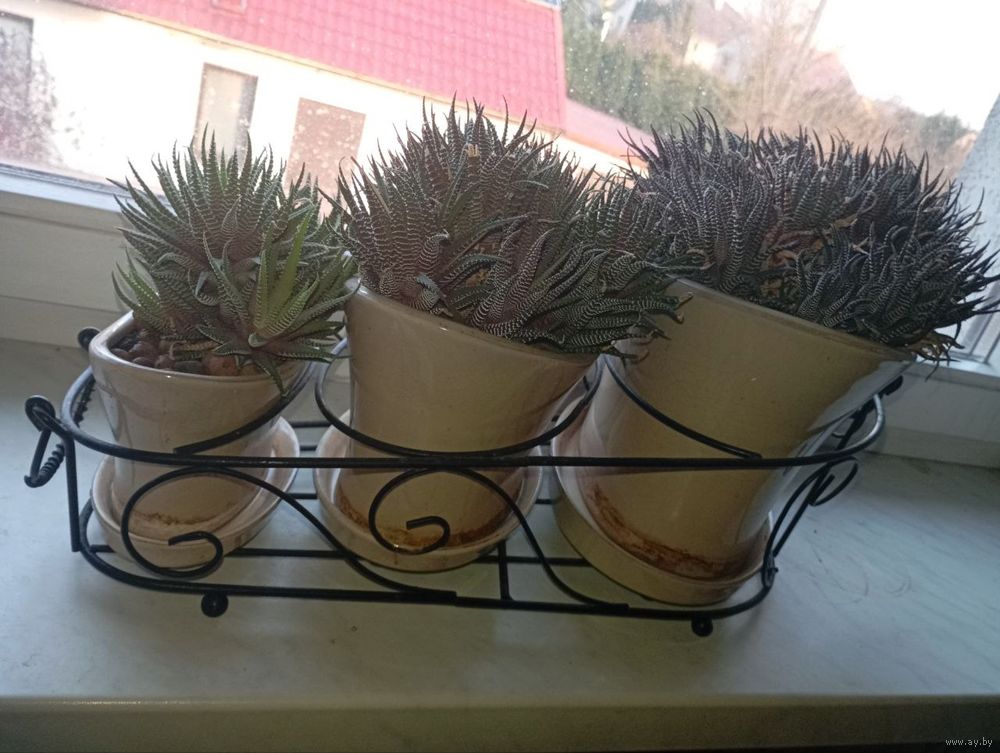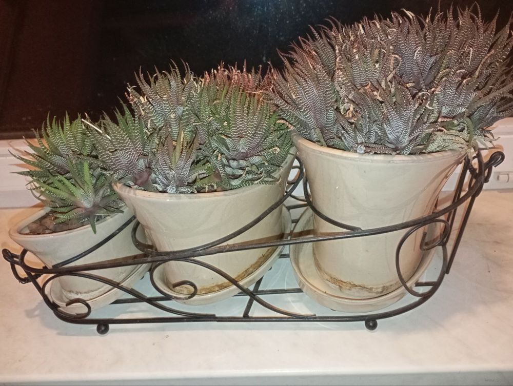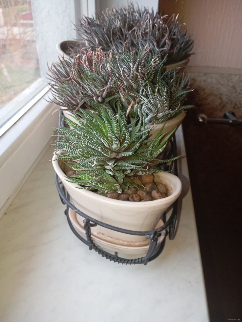 Растение: хавортия полосатая – очень неприхотливое, требующее редкого полива, не производящее мусор на подоконнике. Можно держать на рабочем или кухонном столе.