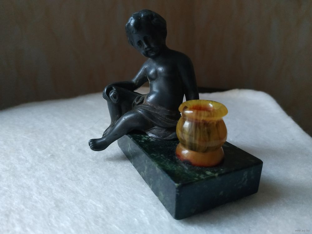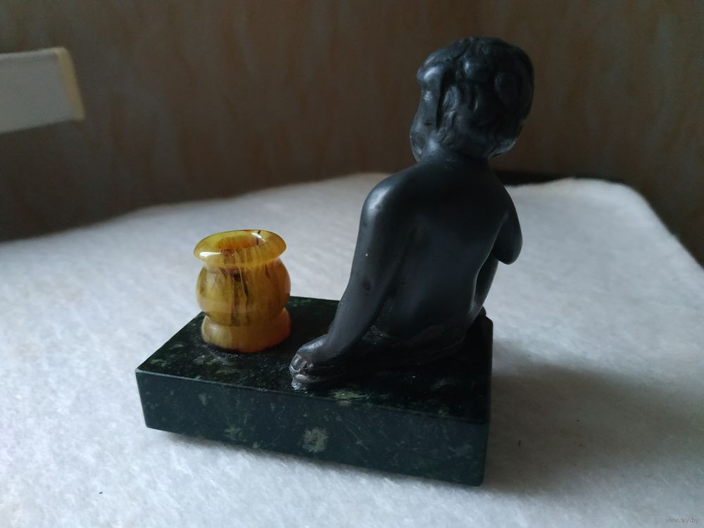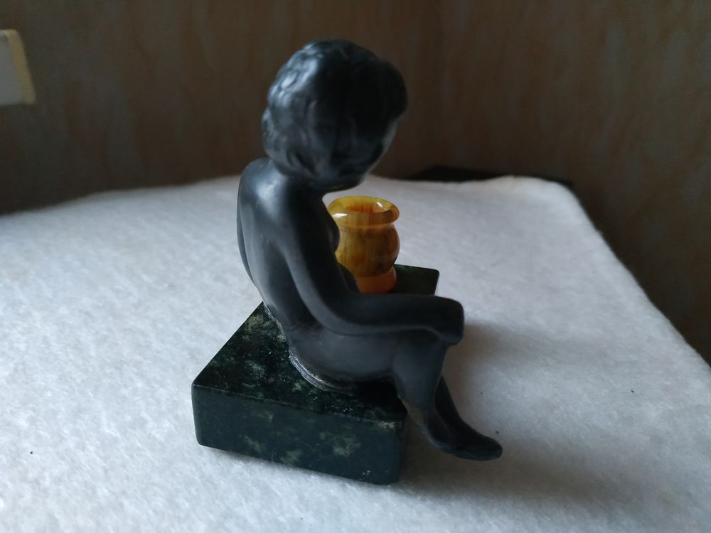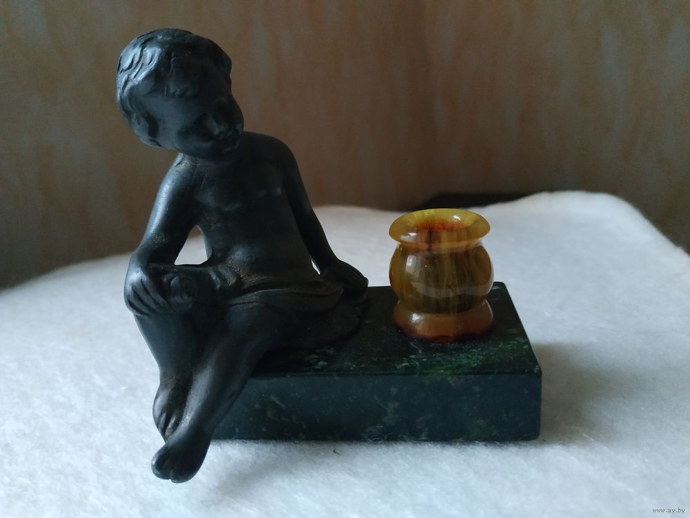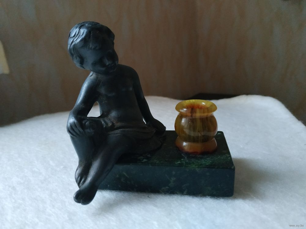 Основание и подсвечник композиции - из натуральных камней разных пород. Фигурка мальчика изготовлена из металла (шпиатр).