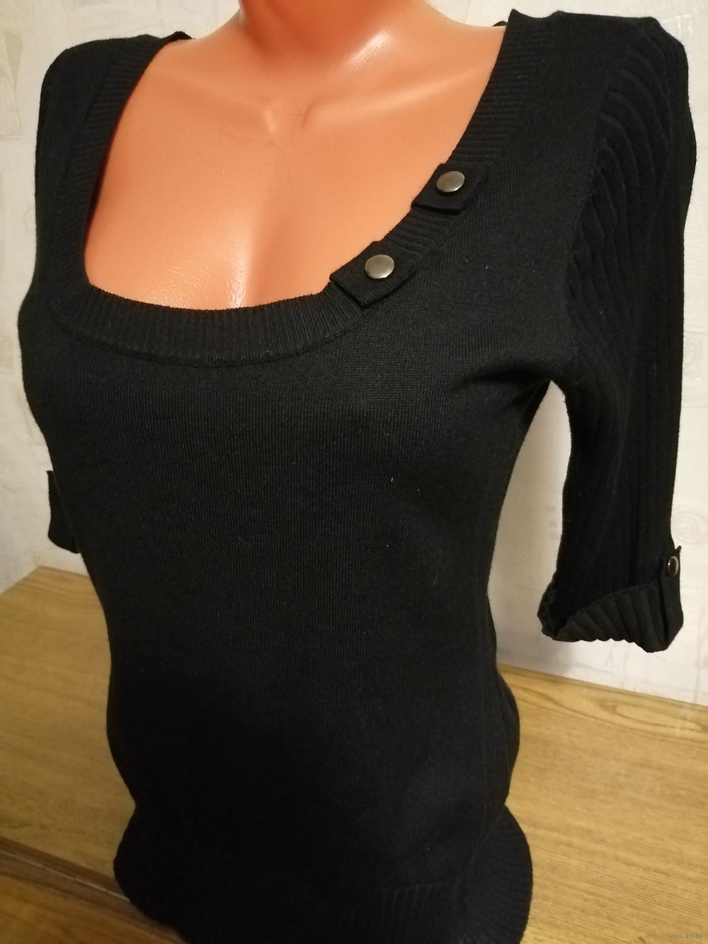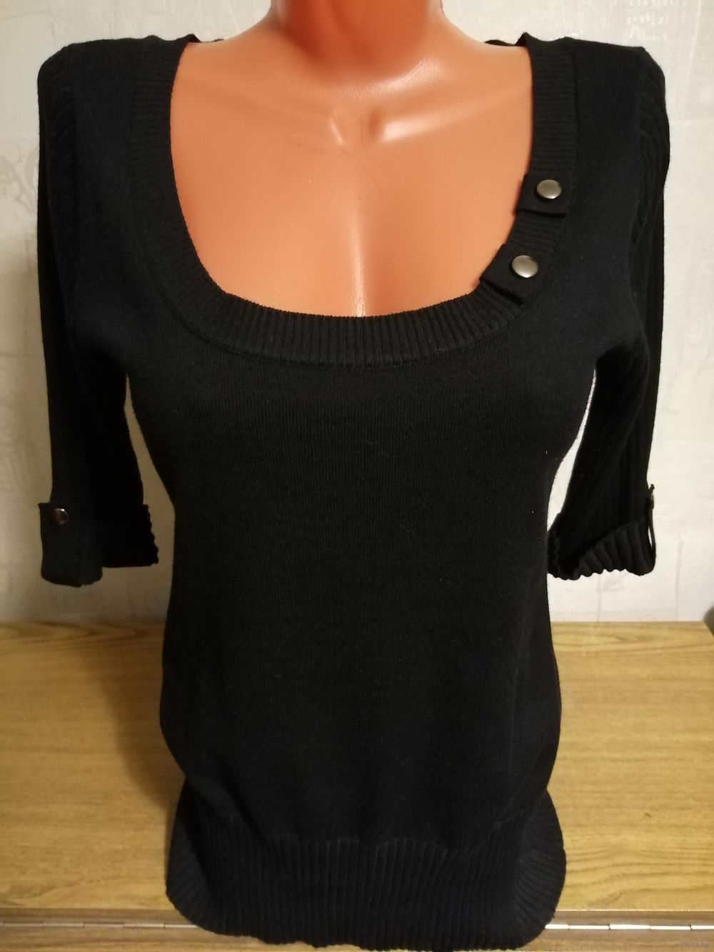 Красивая трикотажная кофточка с глубоким декольте. НОВАЯ, но без этикетки. Цвет насыщенный черный . Хорошо тянется, подойдет от 48 до 52 размера. Рукав 3/4.Длина от плеча 68 см.Покупалась в США. Также в моих объявлениях много других новых и б/у, в отличном состоянии вещей. Смотрите и выбирайте. Высылаю почтой наложенным платежом. Предоплата за пересылку 10 руб. ( можно на телефон).