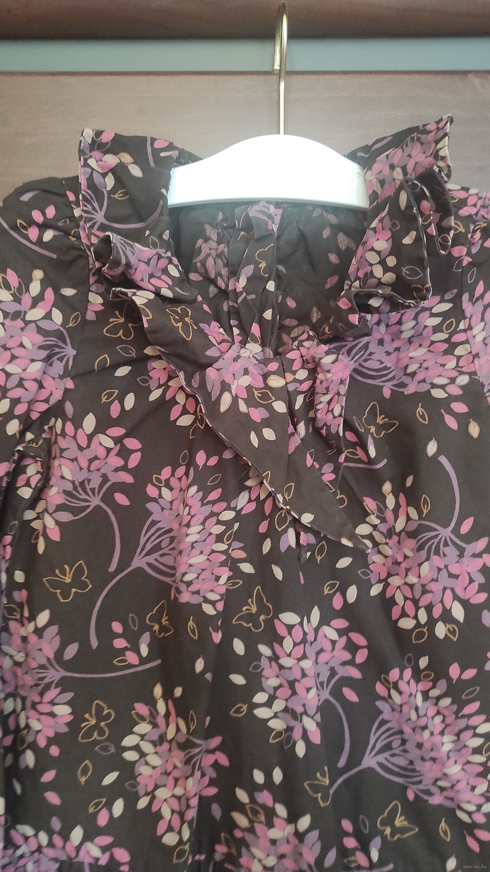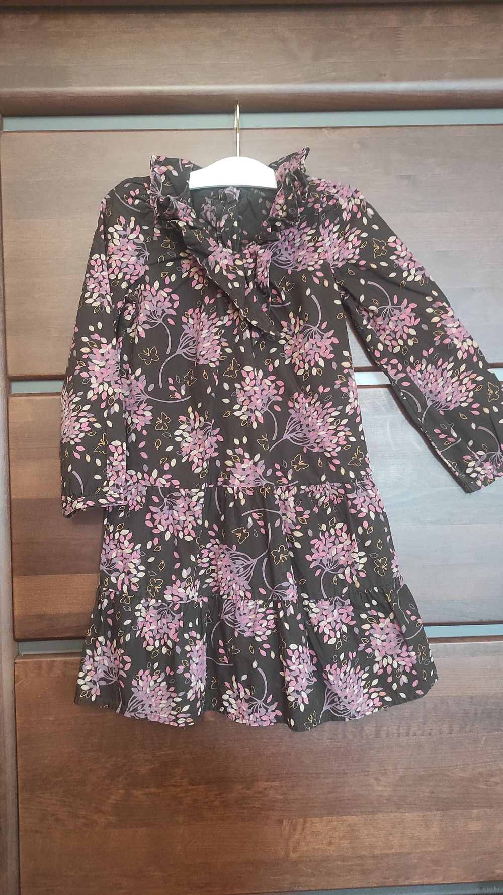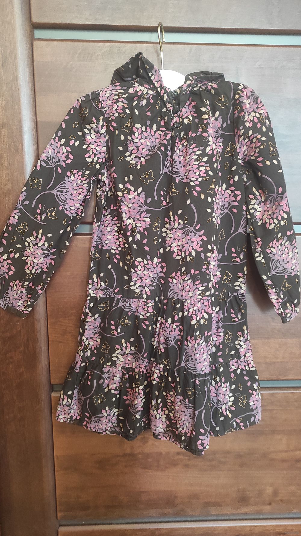 Красивое платье Baby Gap на рост 110 см. Коричневый цвет с рисунком, держит форму, очень красиво сидит на фигуре. Длина 58 см, длина рукава 38 см, ПОгруди 31 см. Очень классное платье.