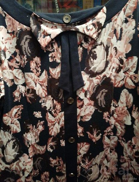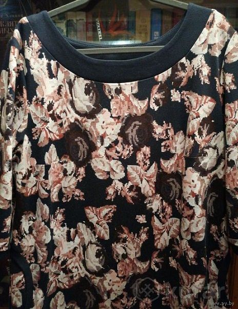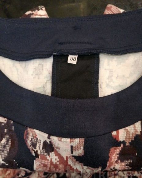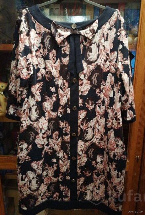 Красивое платье на р-р 56-58, в состоянии новой вещи, по груди вытачки, хорошо ложится по фигуре, интересный фасон, на спинке отделка пуговицами. ПОГ 58см, ПОБ 63см, длина по спинке от горловины 98см, рукав 45/28см. Основной цвет темно-синий, почти черный.