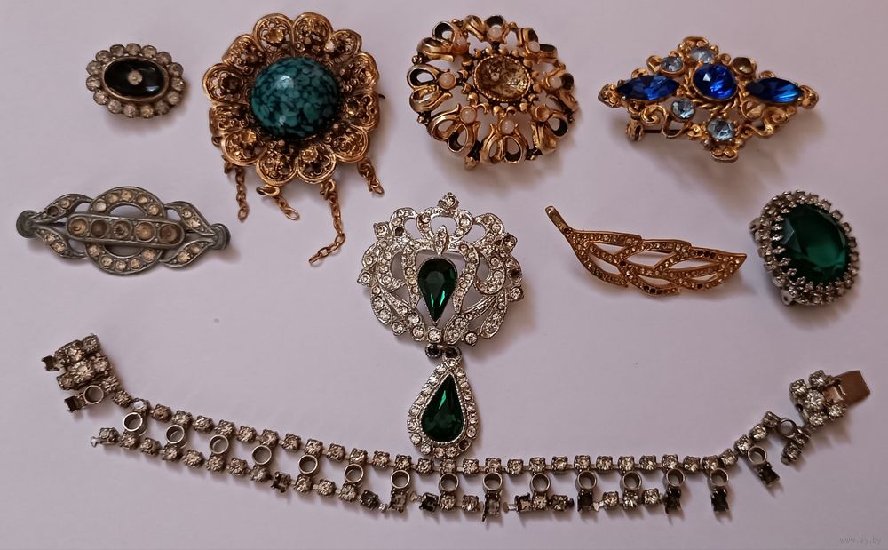 Времён СССР. Есть позолоченные. Всё с дефектами. В бонус браслет, тоже с дефектами. Первая брошка возможно серебряная ..Доставку оплачивает покупатель при получении лота на Белпочте. Полная предоплата до отправки лота по почте. Смотрите и другие мои лоты, выставлено много интересных лотов с 1 рубля! Качественную упаковку гарантирую! Отправка Белпочтой. Выход на связь в течении трёх дней, выкуп лота в течении семи дней, далее черный список и отрицательный отзыв! Делайте обдуманно Ваши ставки, прежде чем покупать лот, хорошо подумайте, нужен ли он Вам! Ставки не отменяю! Купленный товар возврату не подлежит.Спасибо за проявленный интерес к данному лоту! Всем удачи в торгах! Подписывайтесь на мои лоты, постоянно выставляю много интересных лотов с 1 рубля!