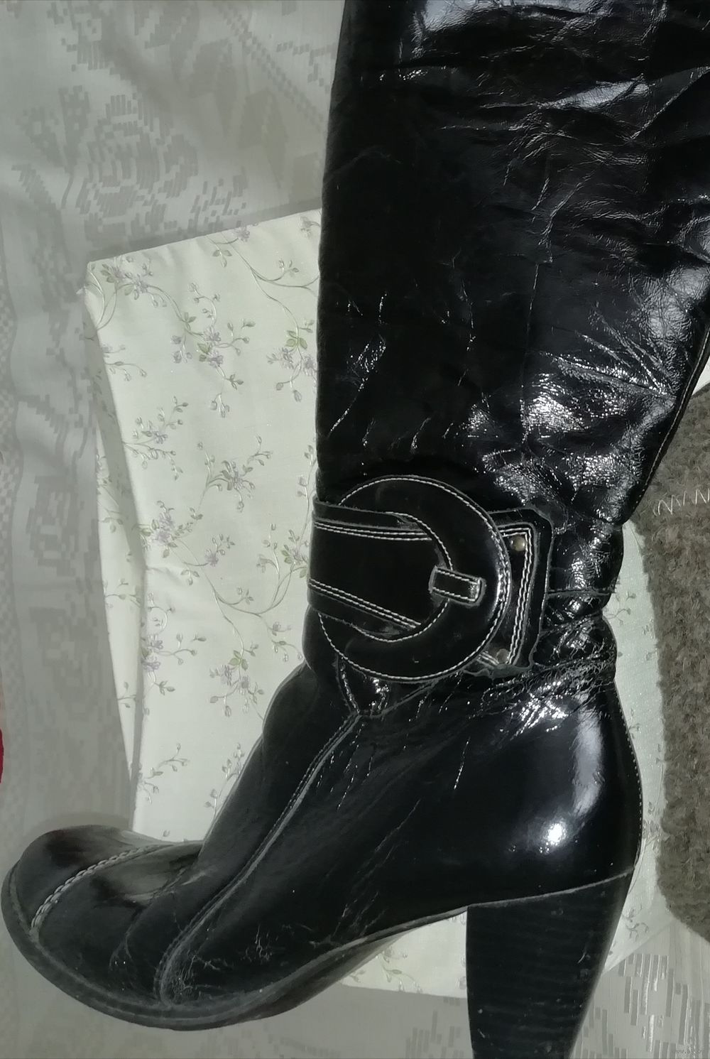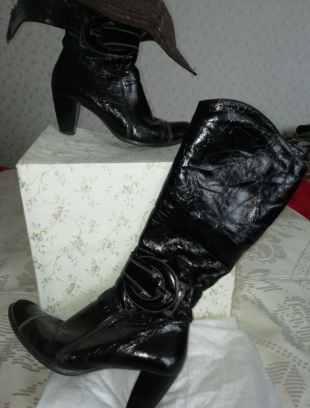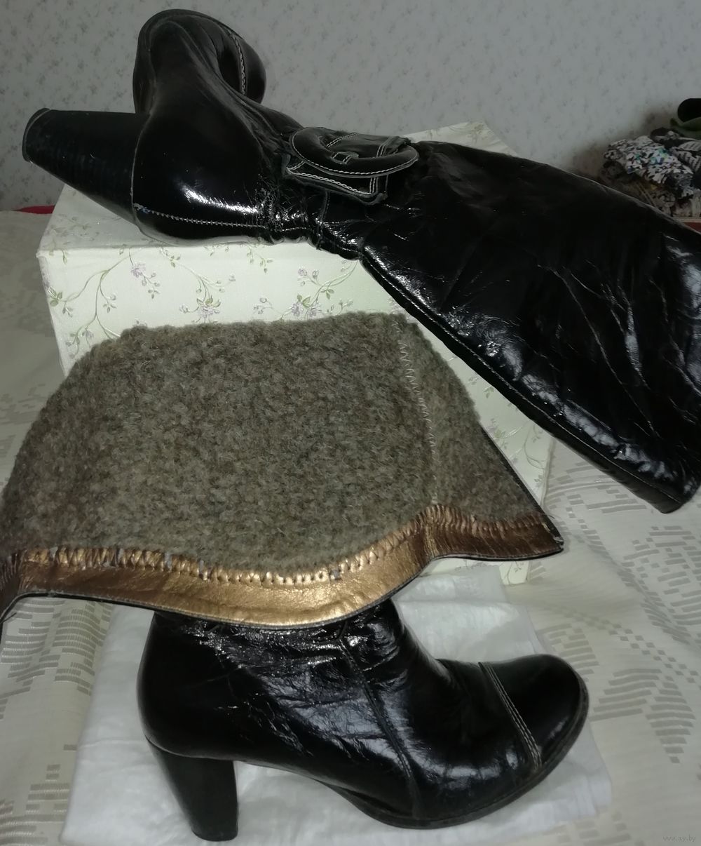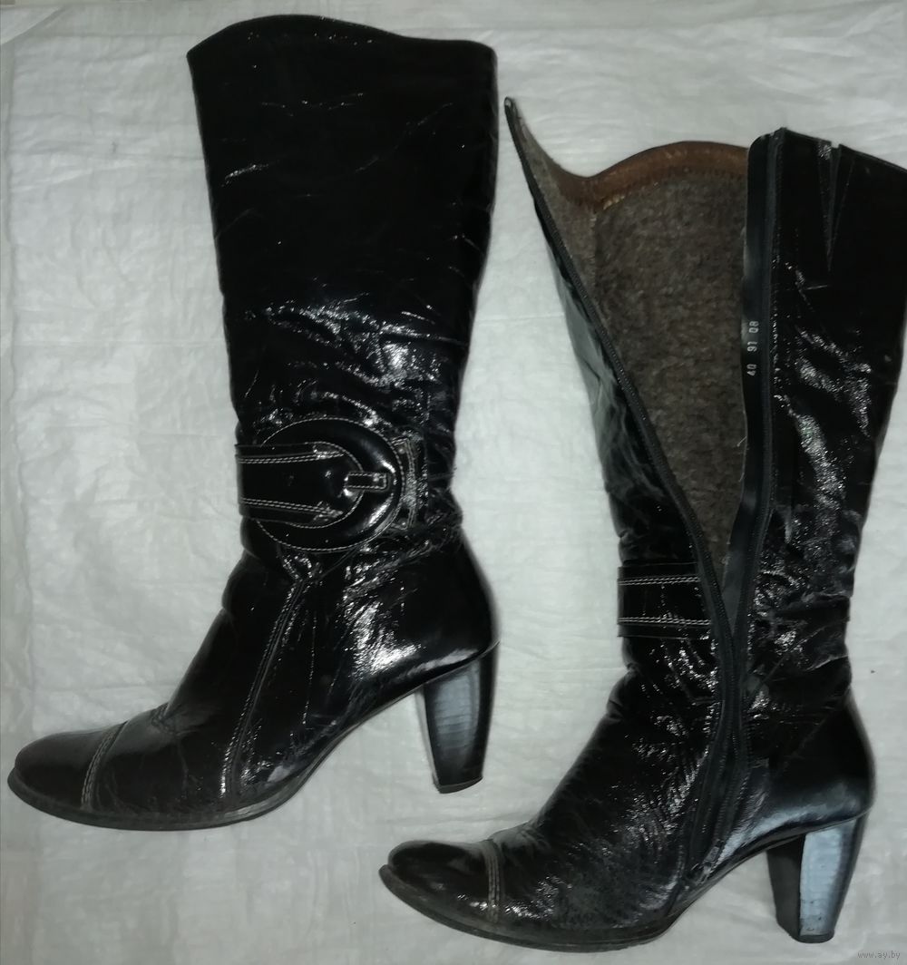 | Сапоги из хорошей натуральной кожи, куплены в Польше, теплые. Маркировка 40,но носили на 39 размер. По верхнему краю сапог 39см, каблук 7,4см от пятки, стелька26, 3см,стельки натуральные, на меху. | |