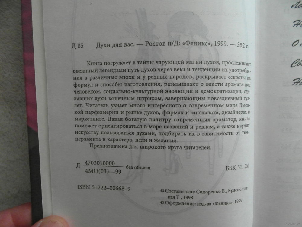 Книга погружает в тайны чарующей магии духов, прослеживает овеянный легендами путь духов через века и тенденции их употребления в различные эпохи и у разных народов, раскрывает секреты их формул и способы изготовления, размышляет о власти аромата над человеком, социально-культурной эволюции и демократизации, сделавших духи конечным штрихом, завершающим повседневный туалет. Читатель узнает много интересного о современном мире Высокой парфюмерии и рынке духов, фирмах и `нюхачах`, дизайнерах и маркетинге. Давая богатую палитру современных ароматов, книга поможет ориентироваться в море названий и реклам, а также научит искусству пользоваться духами, подбирать их в зависимости от темперамента и характера, цели и желания. Предназначена для широкого круга читателей. Вес 380 г.