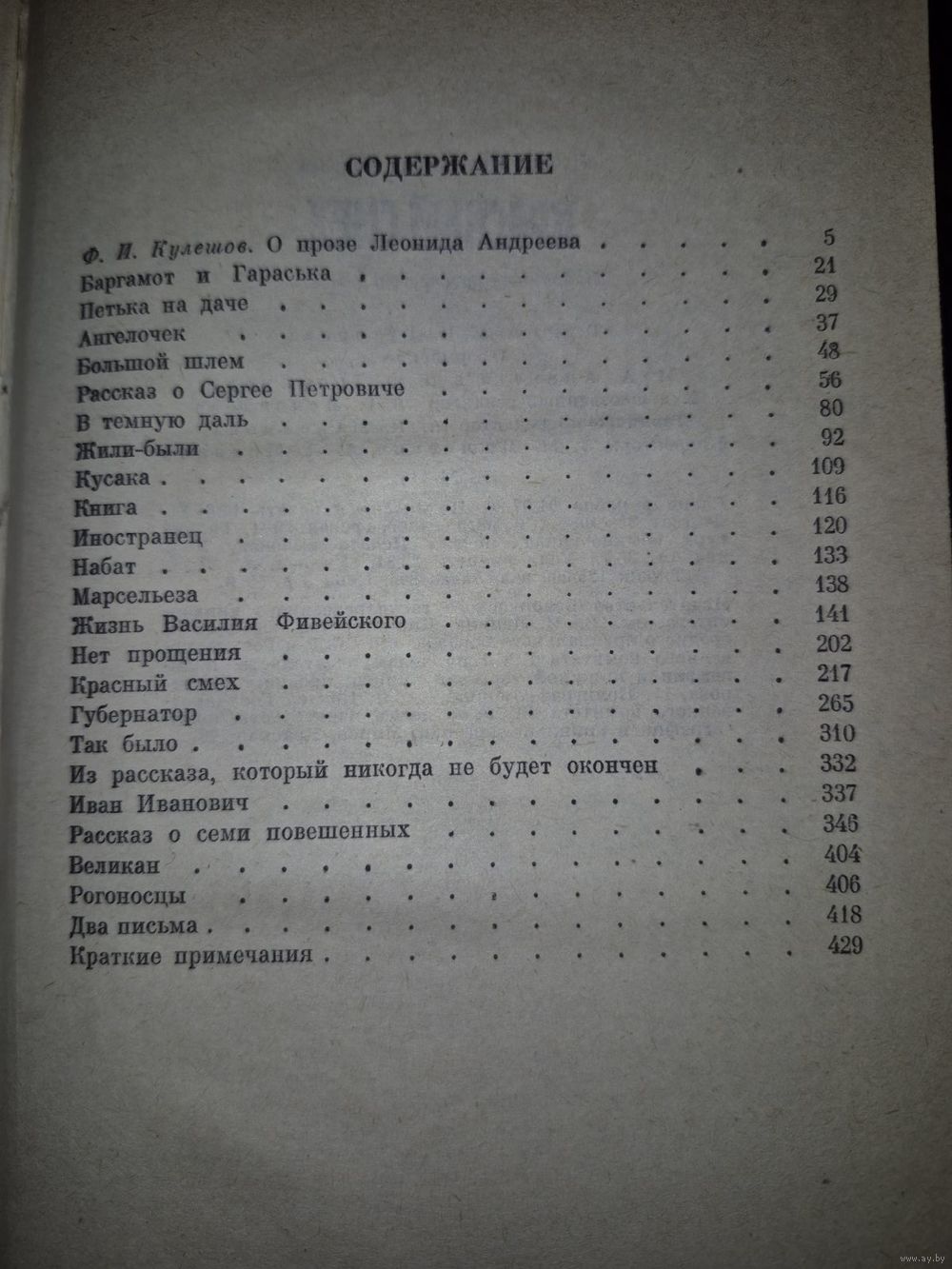 В книгу избранной прозы Л.Андреева — одного из популярнейших в предоктябрьскую эпоху русских писателей — вошли его наиболее известные рассказы и повести «Баргамот и Гараська», «Петька на даче», «Ангелочек», «Большой шлем», «Иностранец», «Красный смех», «Рассказ о семи повешенных» и др., а также мало знакомые современному читателю произведения «Великан», «Рогоносцы» и «Два письма».