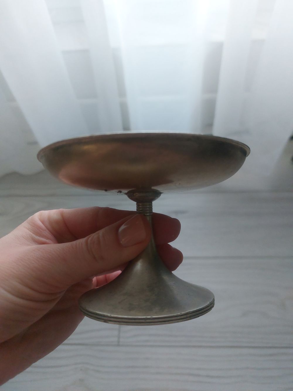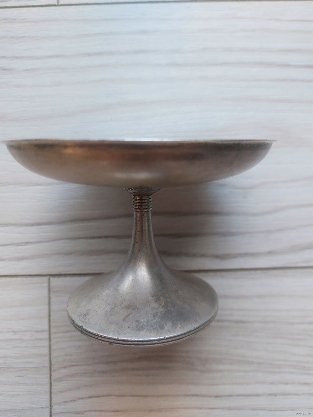 Это винтажная сервировочная креманка, возможно, из посеребренной латуни или нержавеющей стали, предназначенная для подачи десертов или закусок, например оливок или орехов.