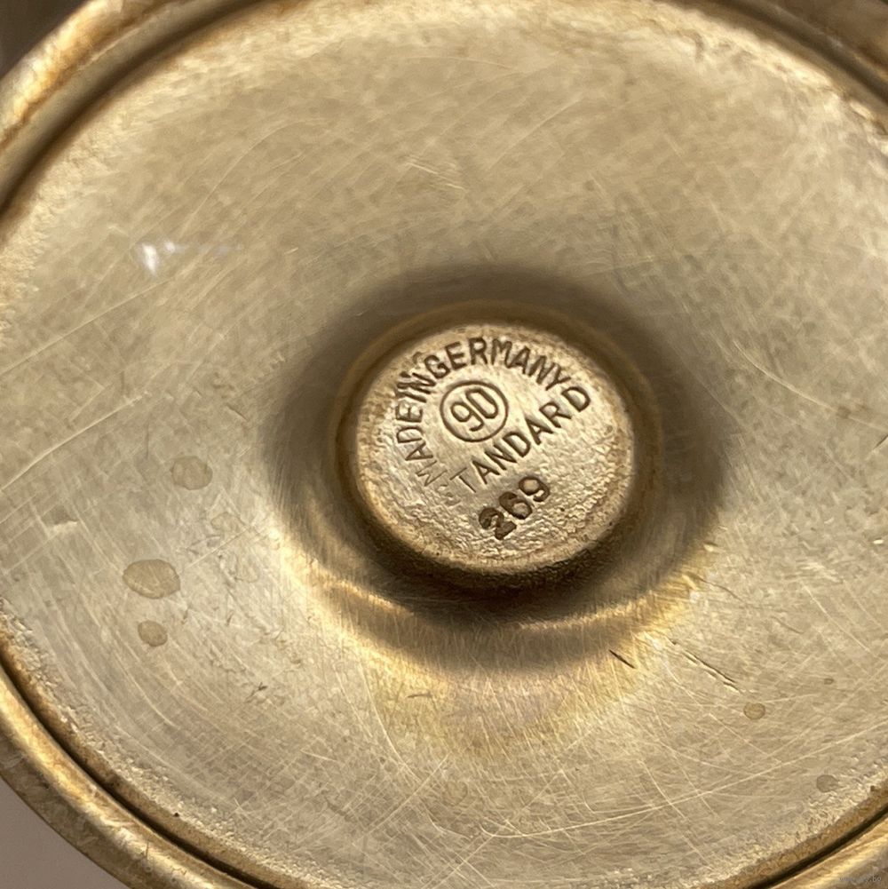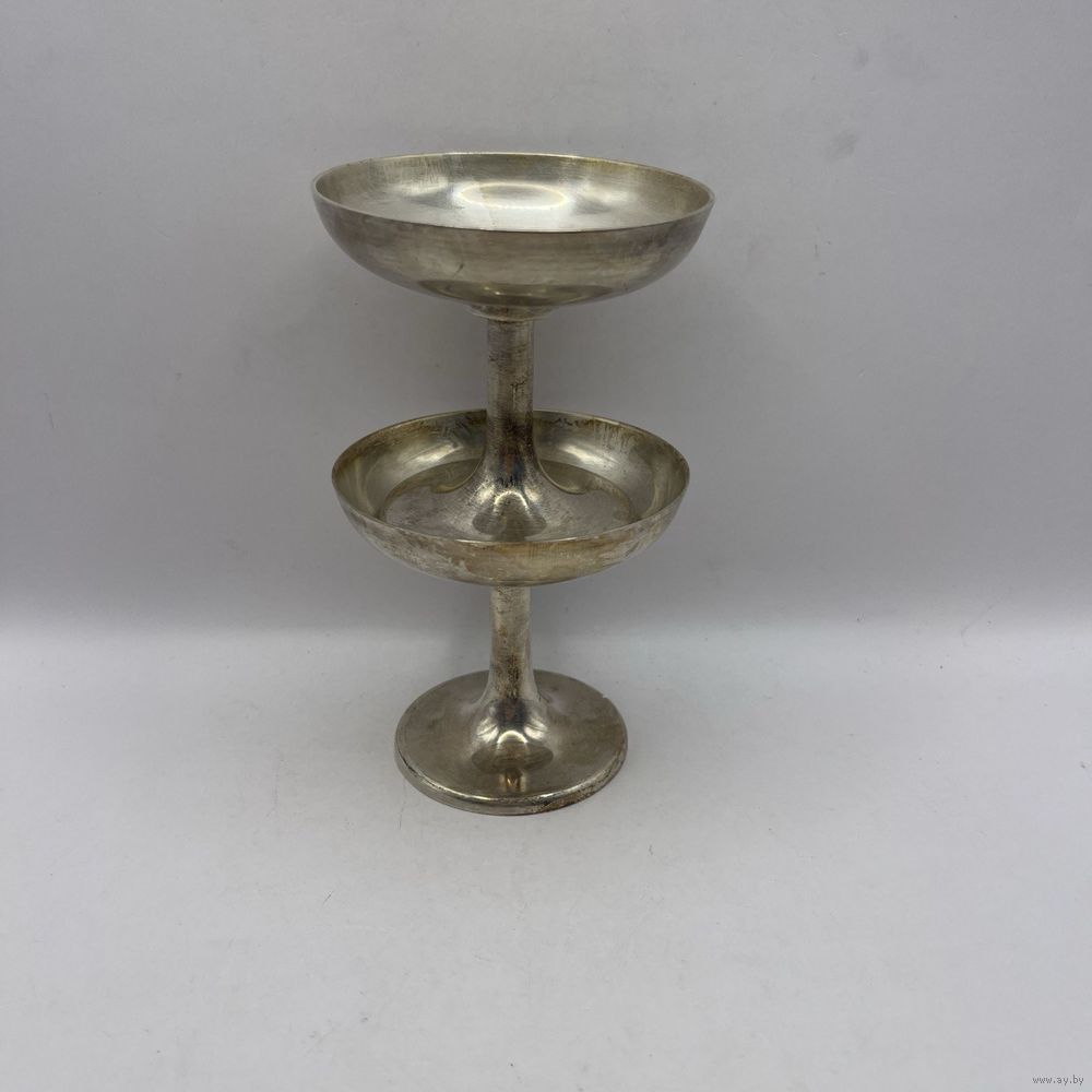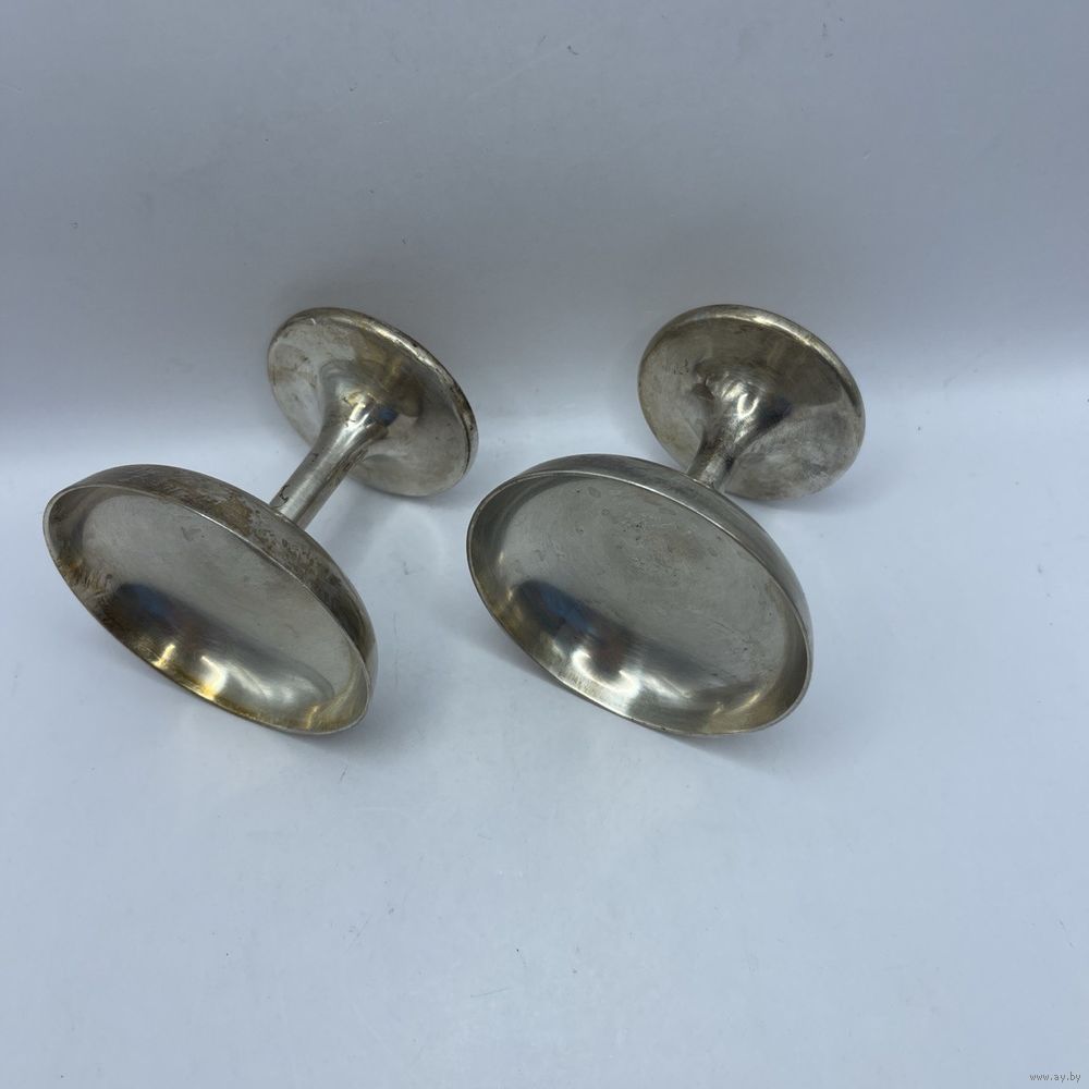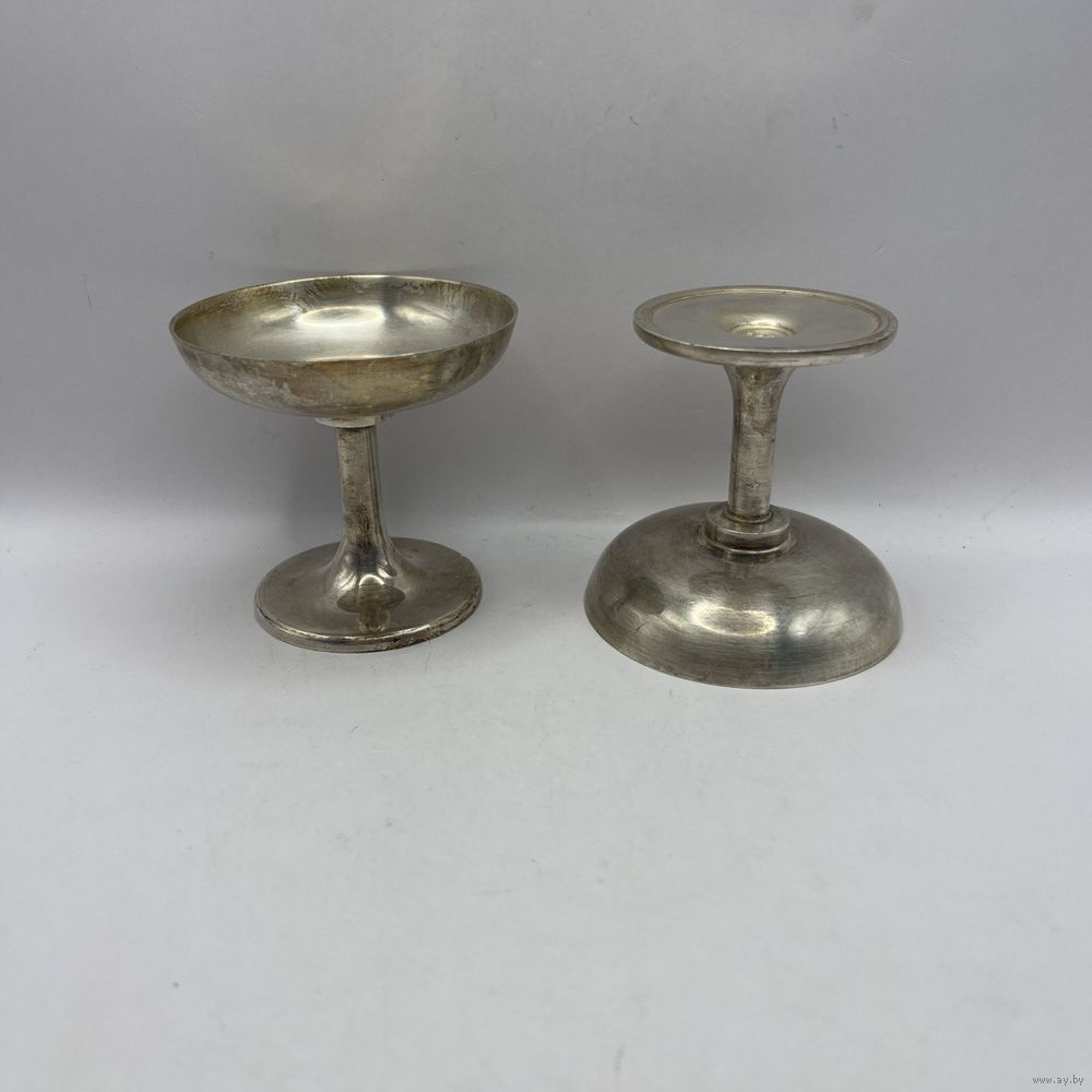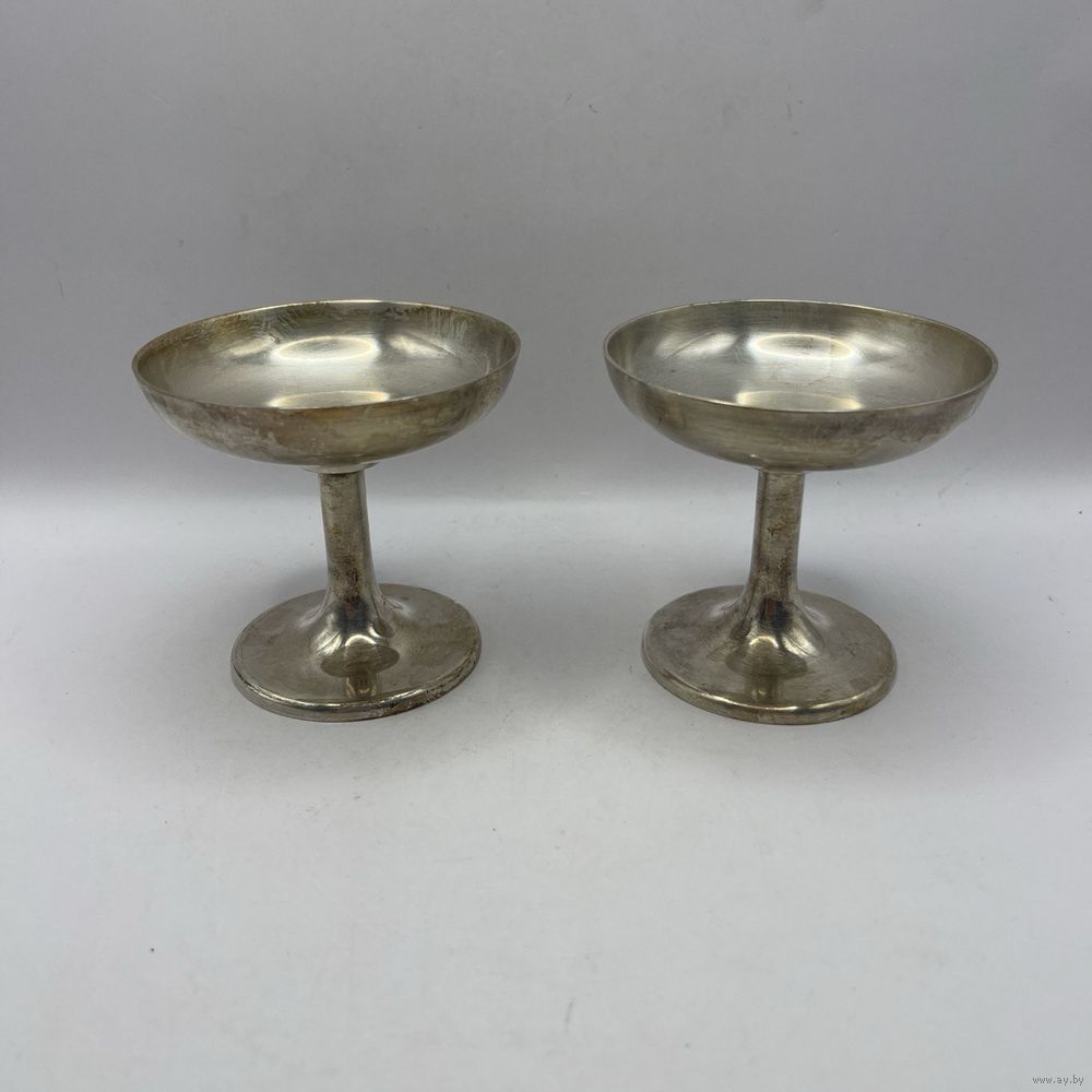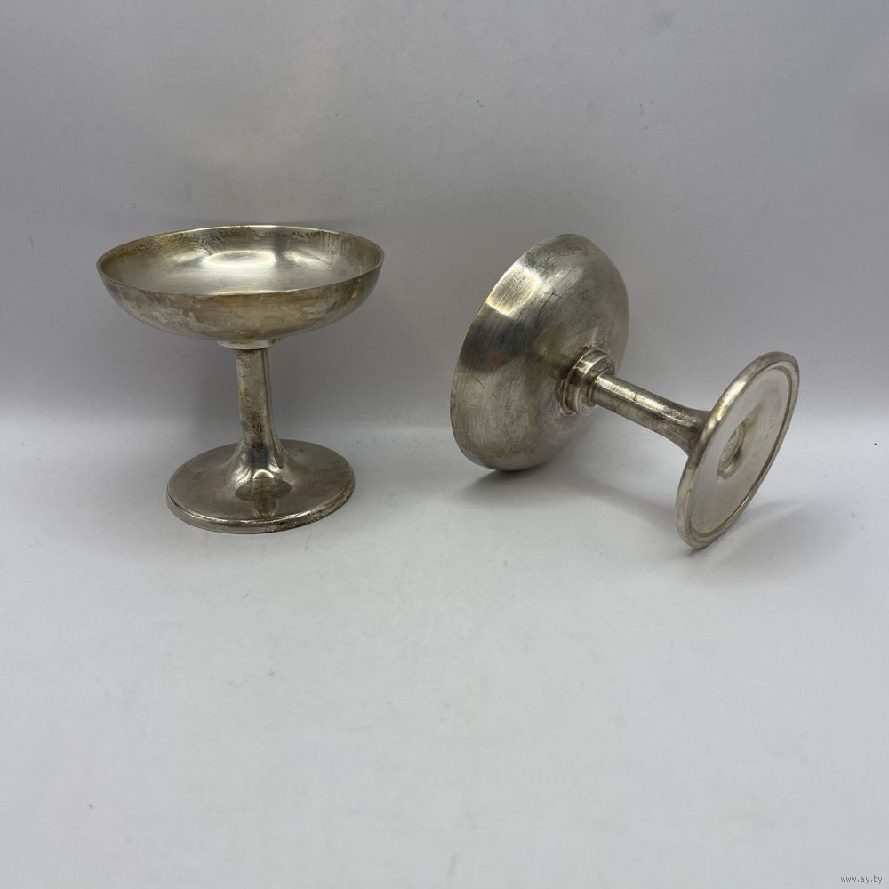 Антикварные сервировочные креманки из латуни с глубоким серебрением, 2 шт. Для подачи оливок, орешков и т. д. Германия. 1950-е г.г. Клейма. Диаметр чаши 7,5 см, высота 7 см. Объем чаши 50 мл. Вес каждой 205 г. Естественная патина.