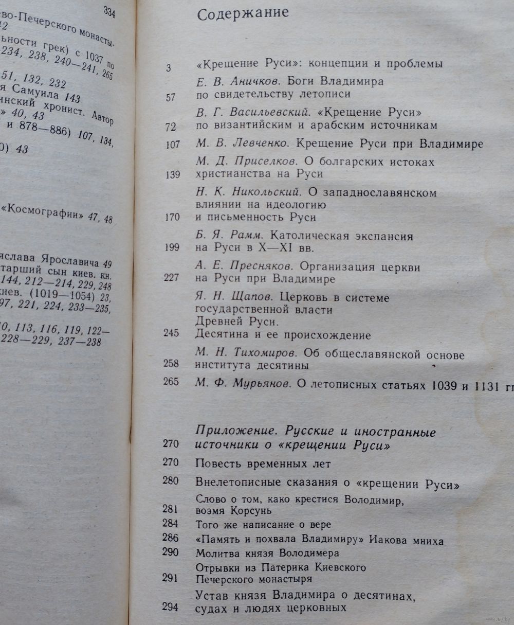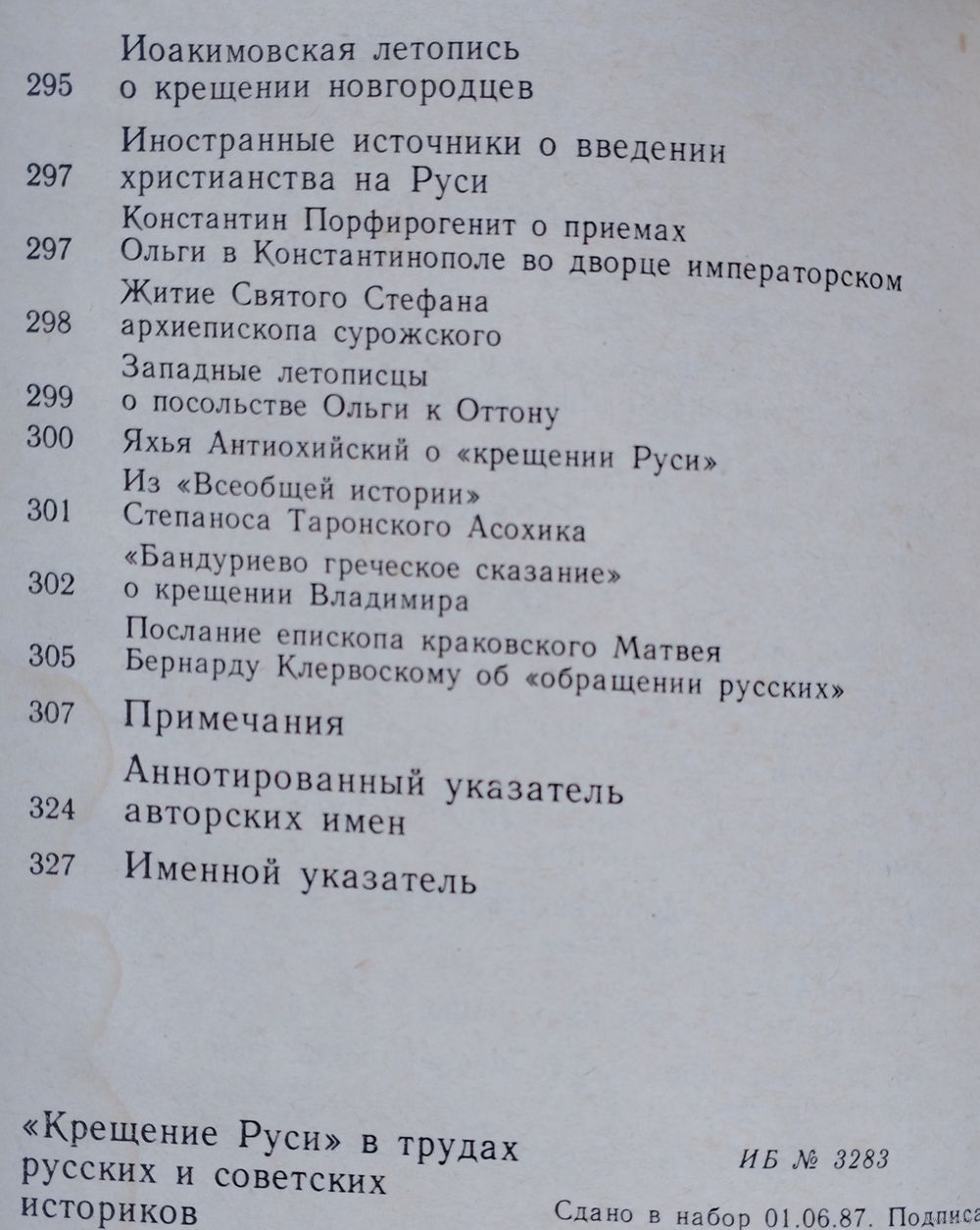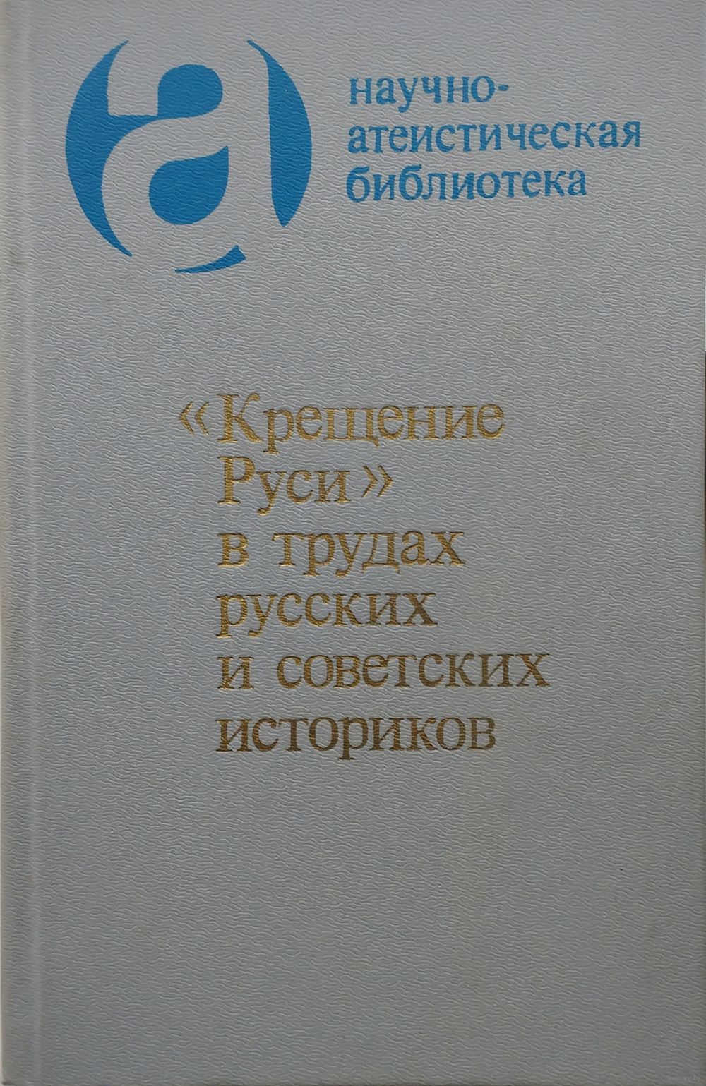 Тираж 25000 экз. 338 стр. Сборник дает представление об основных концепциях русской и советской исторической науки по введению христианства на Руси. Вступительная статья характеризует общее состояние науки по этой проблеме. Приложение включает выдержки из древнерусских летописных и внелетописных, а также иностранных источников, связанные с "крещением Руси".