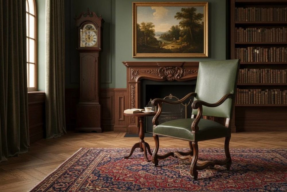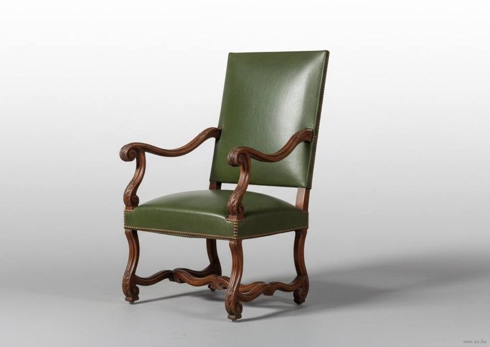 Резное деревянное кресло. Подлокотник и изогнутое основание с H-образной опорой. Обивка из зелёной кожи.