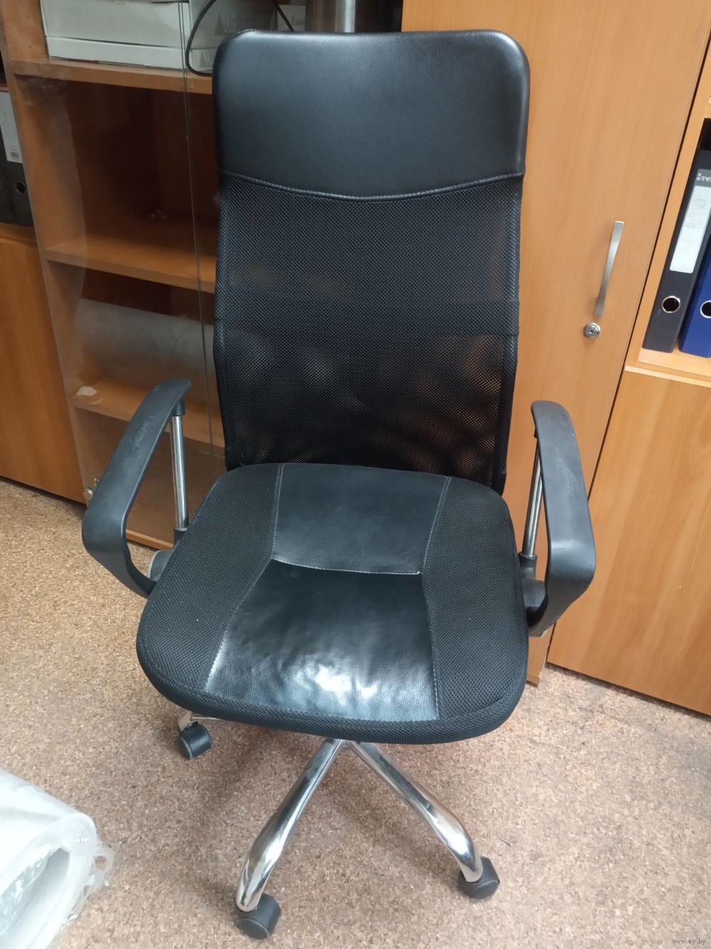2. Кресло черное спинка сетка: не работает механизм подьема-опускания, нет одного колеса.